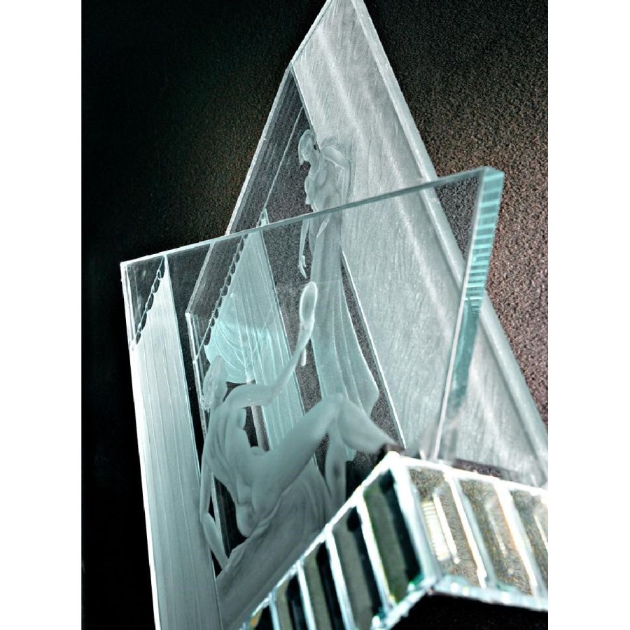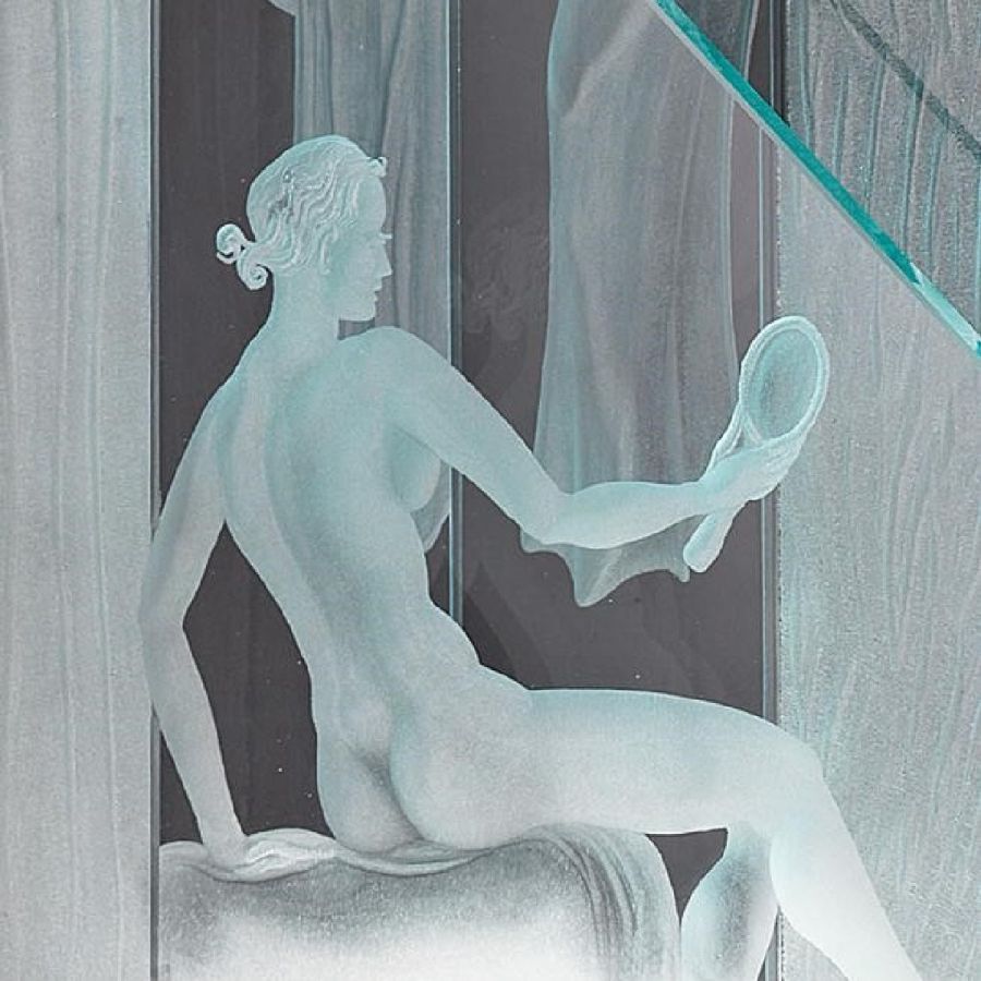 Art Déco Wall Light with one engraved transparent glass light. Structure in chromed brass and bevelled antiqued mirror.