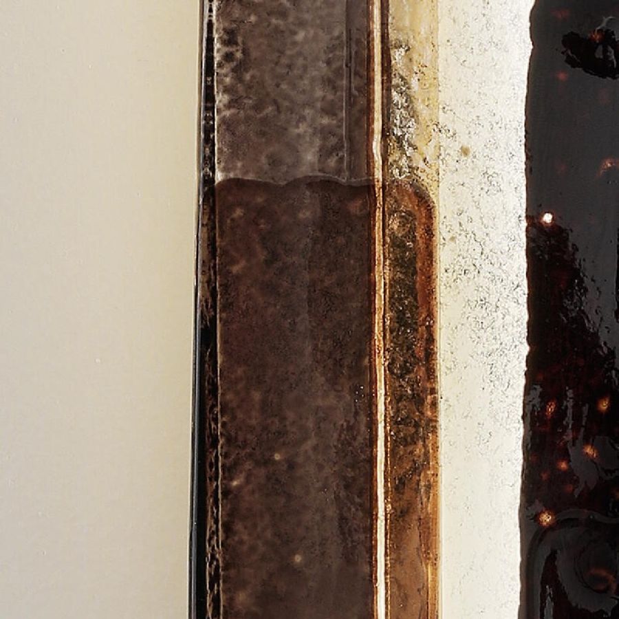 Metal structure with shiny brass finish. Baked glass in two layers with irregular edges decorated with colored stripes and partially silvered on the back.