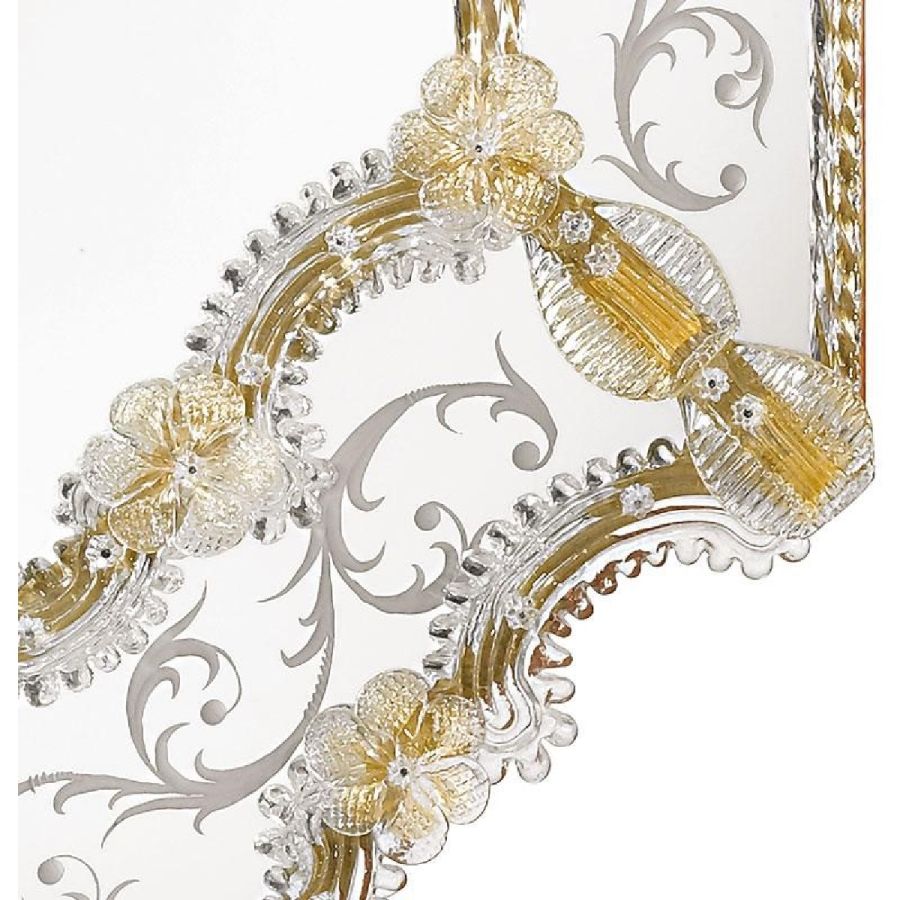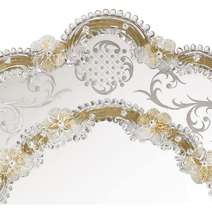 The most famous characters are the typical engraved curl finishings together with the depiction of Bacco, Justice or the well-know Venetian Eighteenth-century. Crystal colored Murano decorative flowers, leaves, twisted ropes and multicoloured glass paste rosettes embellish each Venetian mirror. The result is a unique item comparable to a work of art for craftsmanship and excellence in its execution.