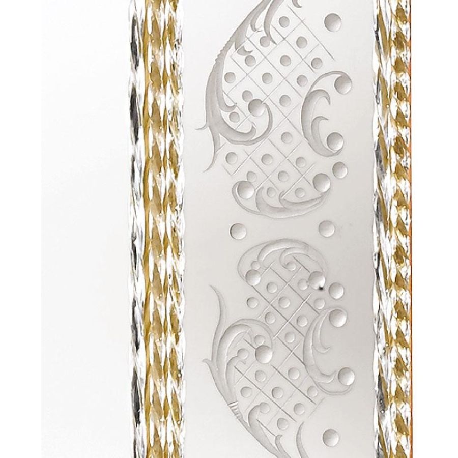 Floral and geometric motif engravings. Decorative leaves, curls, rosettes and twisted ropes made of crystal and gold coloured Murano glass.
