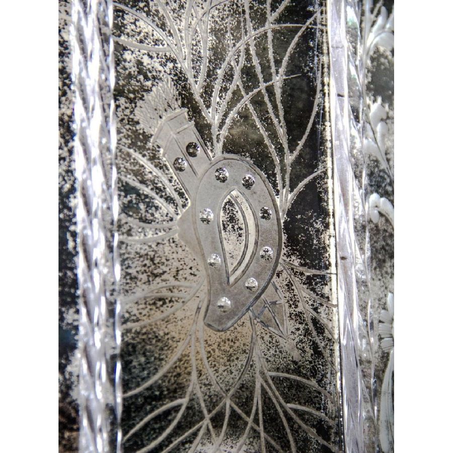 Floral and allegoric motif engravings. Decorative leaves, rosettes and twisted ropes made of crystal coloured Murano glass.