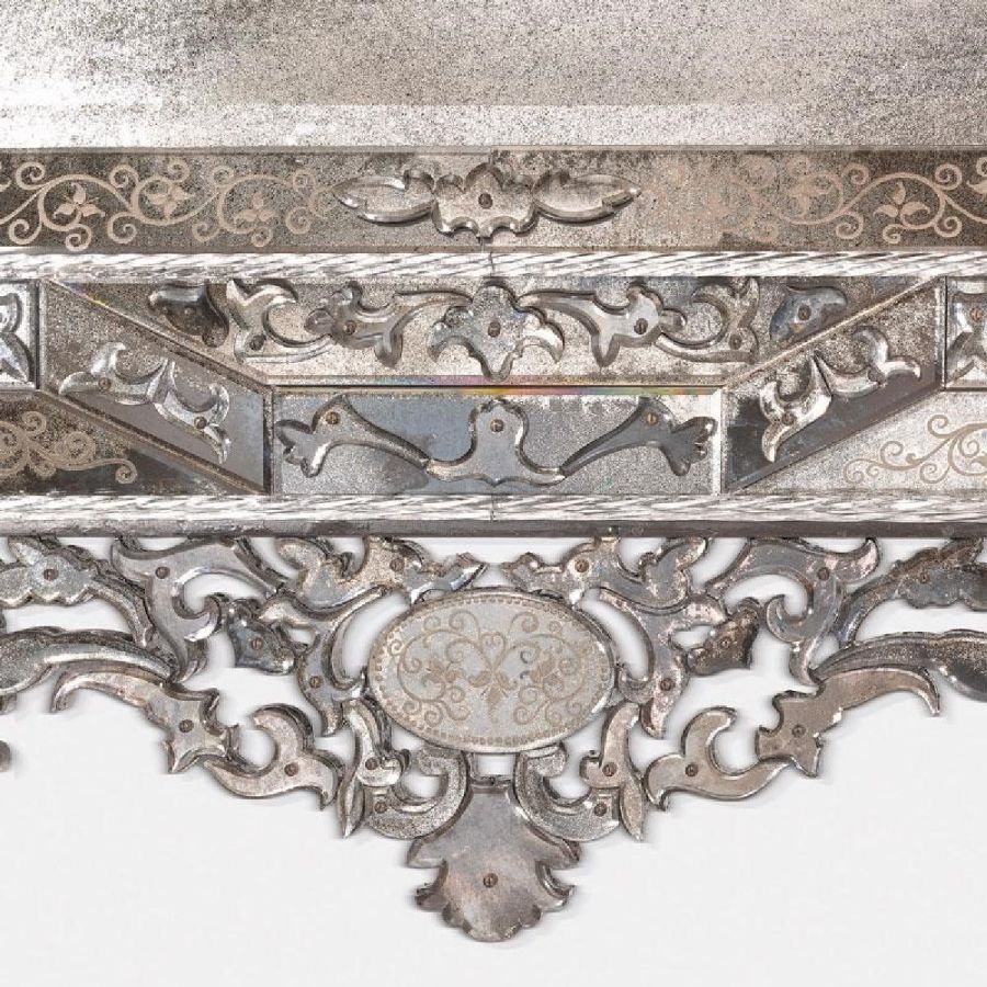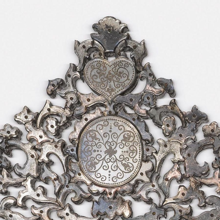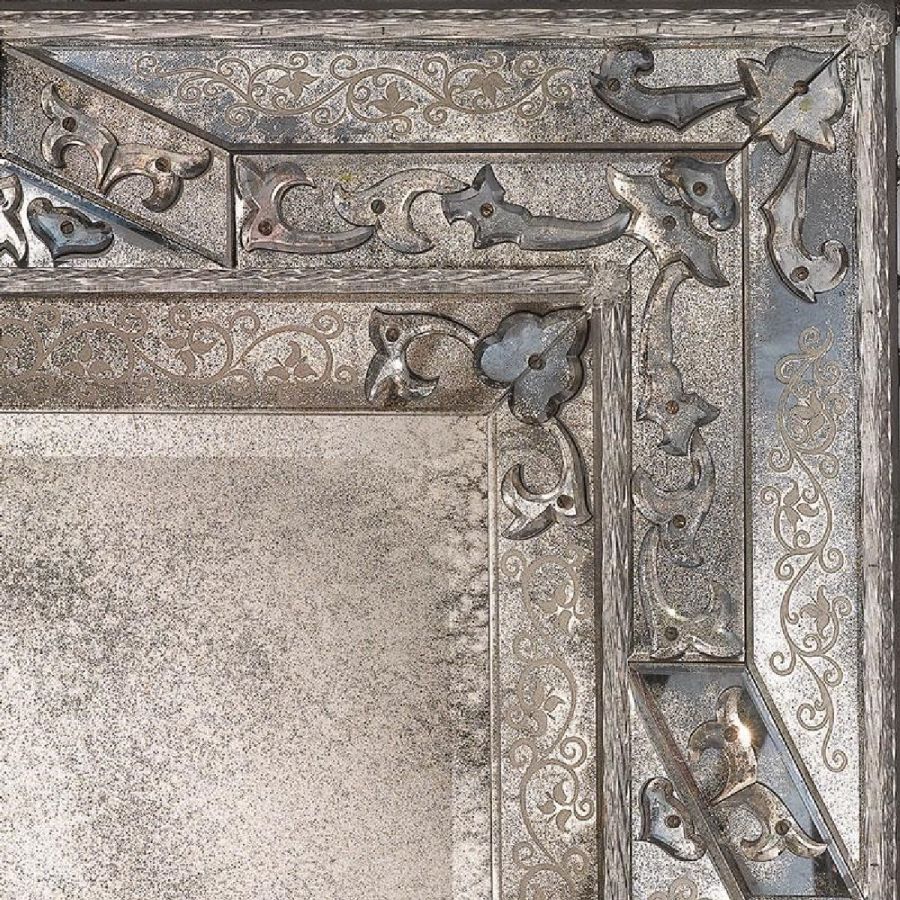 Fretworked and antiqued mirror in Venetian style with floral engravings made with a diamond grinding wheel. Beveled mirror fixed with antiqued screws. Structure in antiqued solid wood, finished in bitumen.