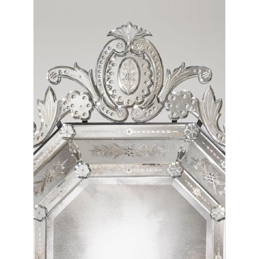 A French mirror is in fact made of lots of different bevelled pieces that are close together and create an harmonious geometrical figure. A beautiful example is, an iconic mirror by Arte Veneziana that is made of 412 hand bevelled pieces. The most visible difference between a Venetian and a French mirror is the total absence of hand-blown glass decorations on the latter.