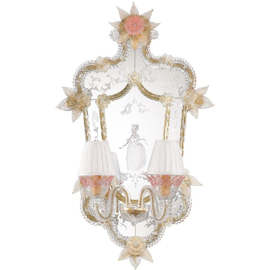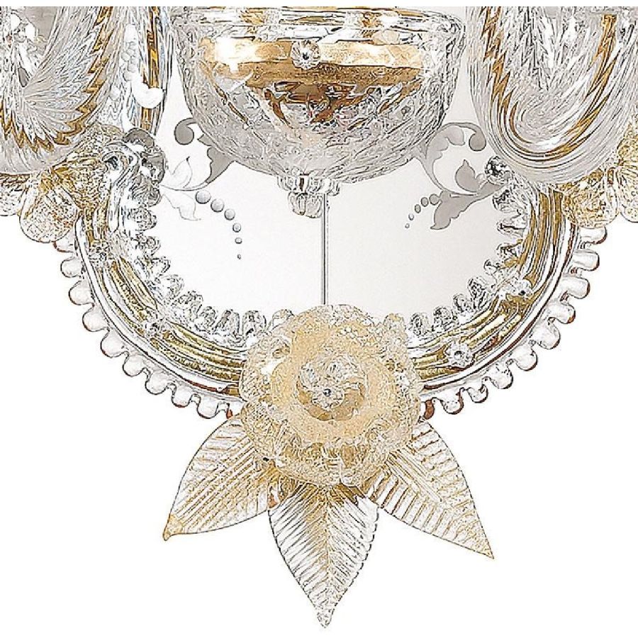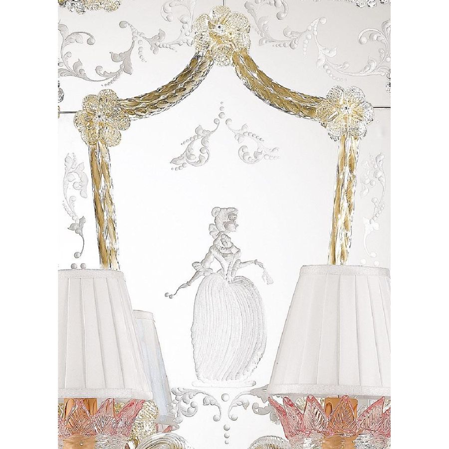 Floral motif and the depiction of the Venetian Countess Querini engravings. Decorative leaves, curls, rosettes and twisted ropes made of crystal and gold coloured Murano glass.
