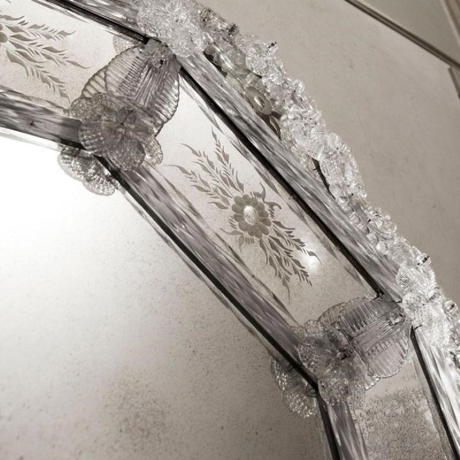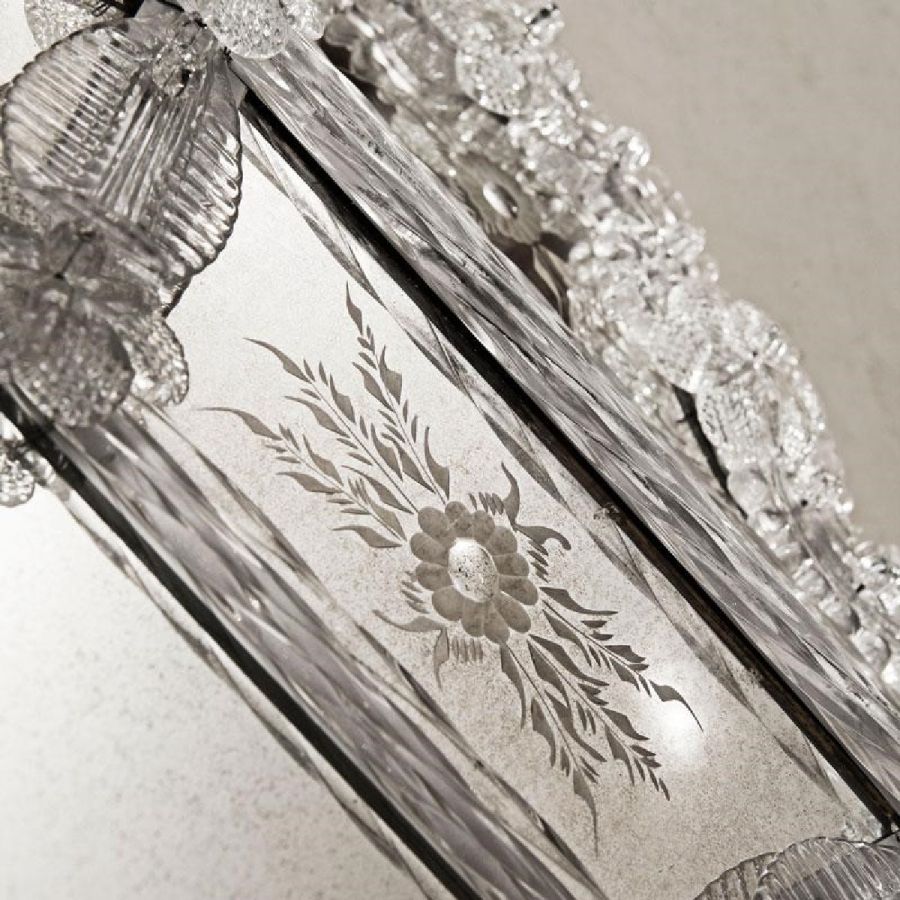 The most famous characters are the typical engraved curl finishings together with the depiction of Bacco, Justice or the well-know Venetian Eighteenth-century. Crystal colored Murano decorative flowers, leaves, twisted ropes and multicoloured glass paste rosettes embellish each Venetian mirror. The result is a unique item comparable to a work of art for craftsmanship and excellence in its execution.
