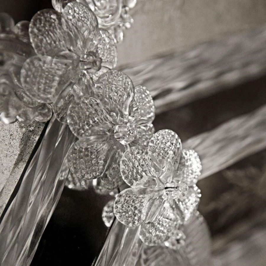 Floral motif engravings. Decorative leaves, curls, rosettes, beads and twisted ropes made of crystal coloured Murano glass with antique finish.