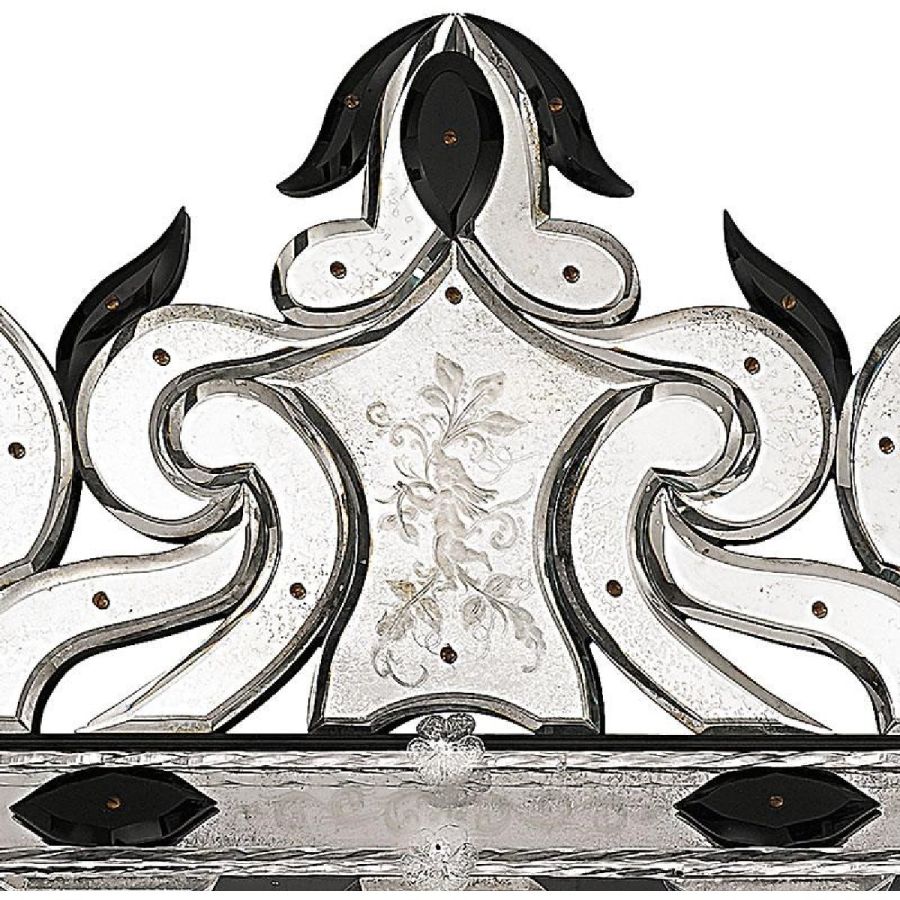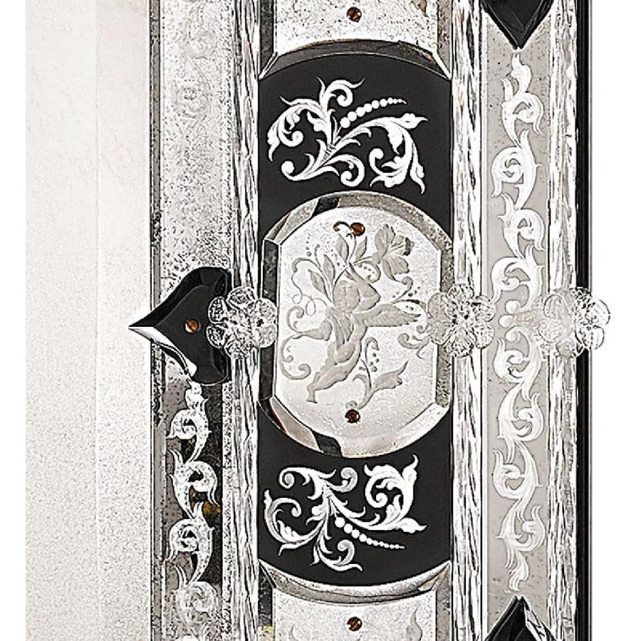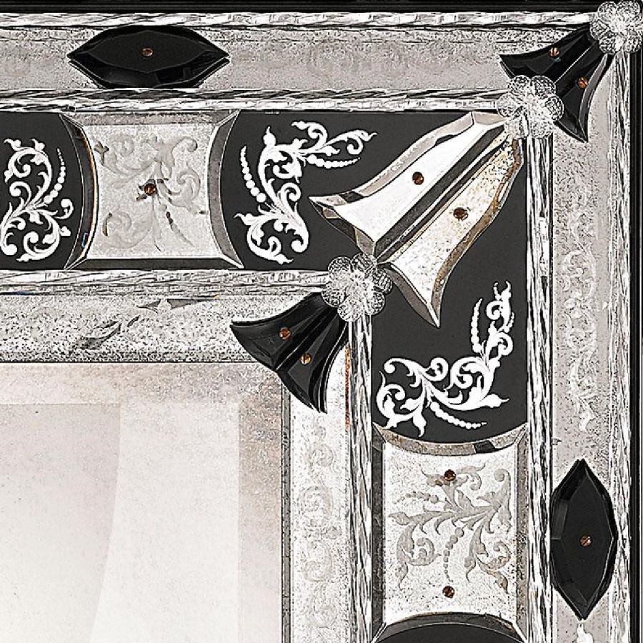 Fretwork structure made of solid wood with black lacquered matte finish. Central part, crest, frames and engraved decorative tiles made of bevelled glass with medium antique mirrored finish.