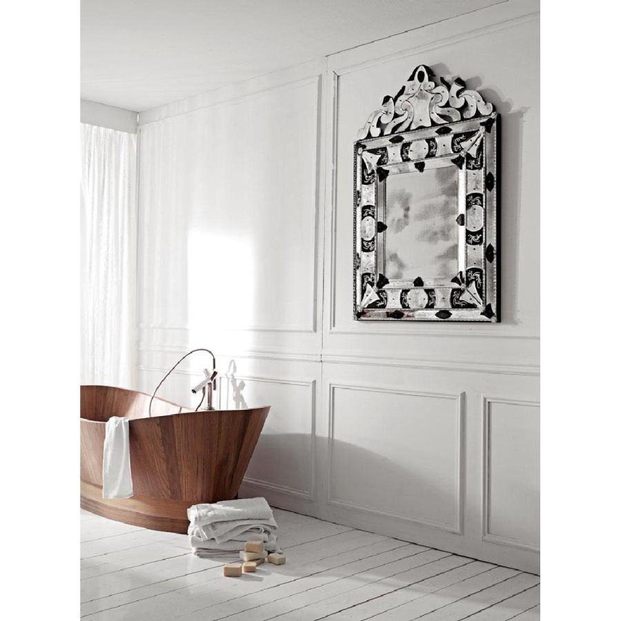 A French mirror is in fact made of lots of different bevelled pieces that are close together and create a harmonious geometrical figure. A beautiful example is, an iconic mirror by Arte Veneziana that is made of 412 hand bevelled pieces. The most visible difference between a Venetian and a French mirror is the total absence of hand-blown glass decorations on the latter.