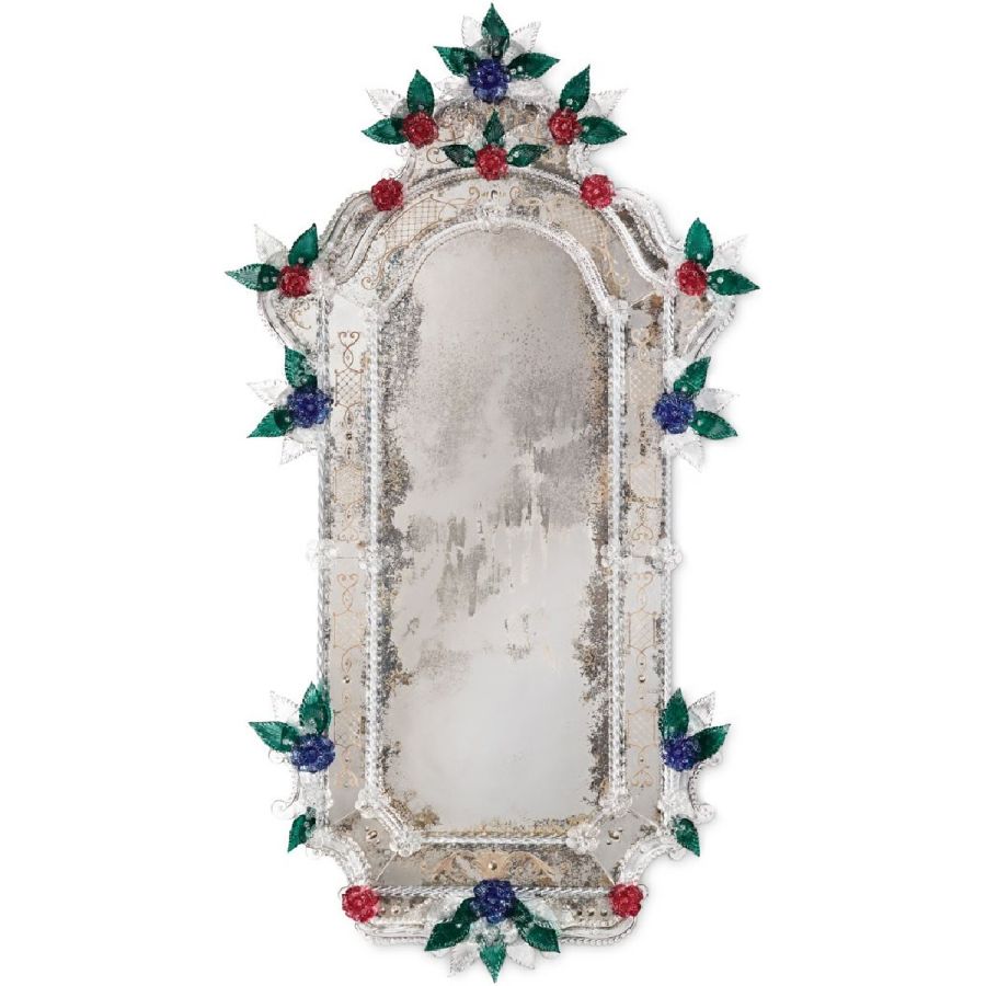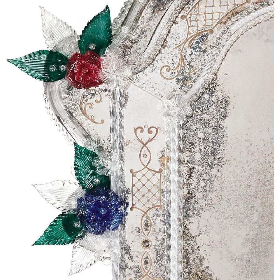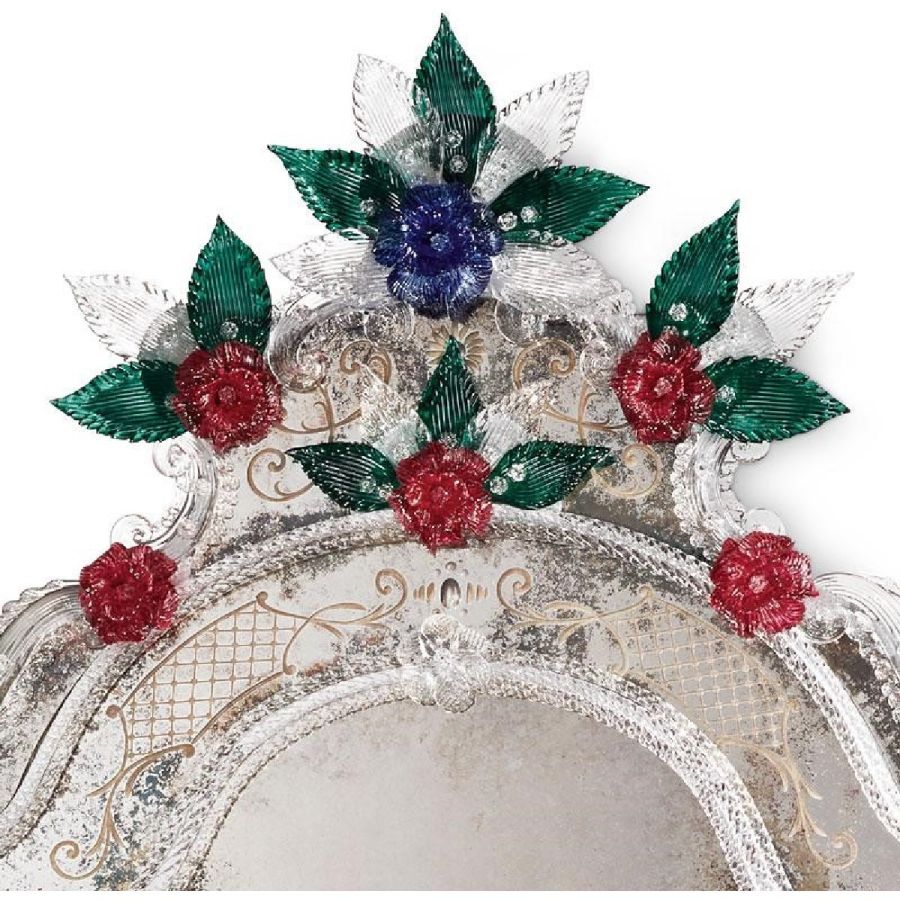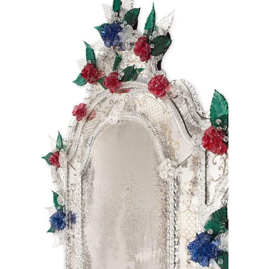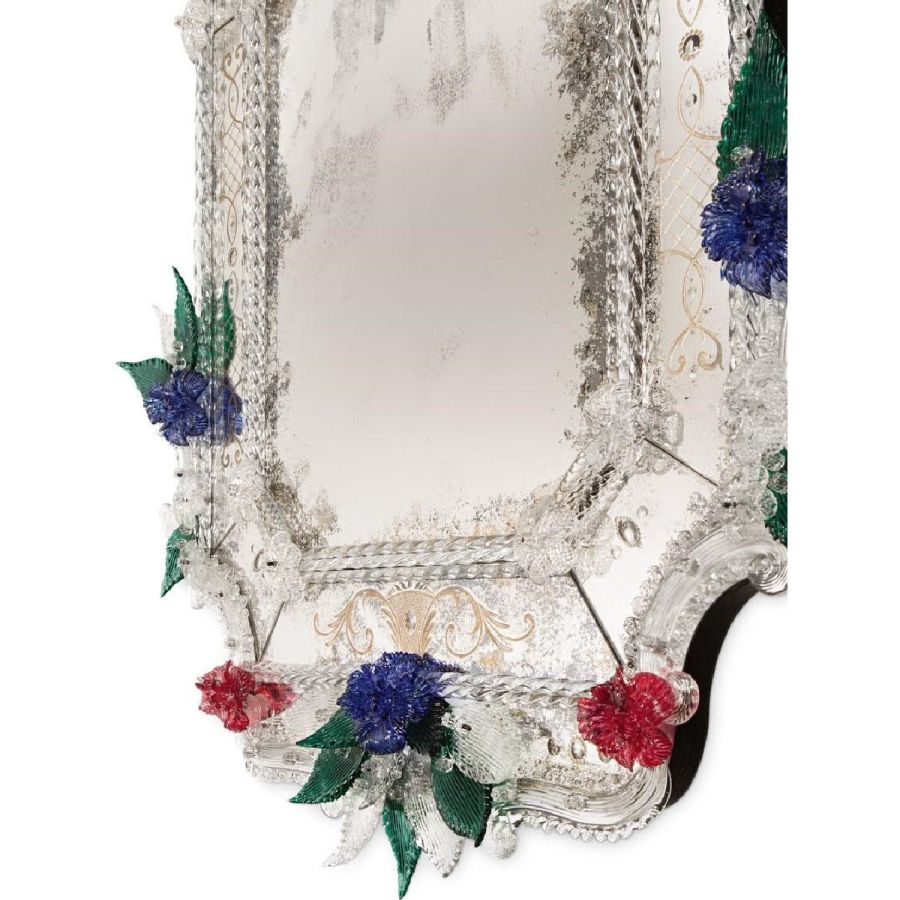 The most famous characters are the typical engraved curl finishings together with the depiction of Bacco, Justice or the well-know Venetian Eighteenth-century . Crystal colored Murano decorative flowers, leaves, twisted ropes and multicoloured glass paste rosettes embellish each Venetian mirror. The result is a unique item comparable to a work of art for craftsmanship and excellence in its execution.