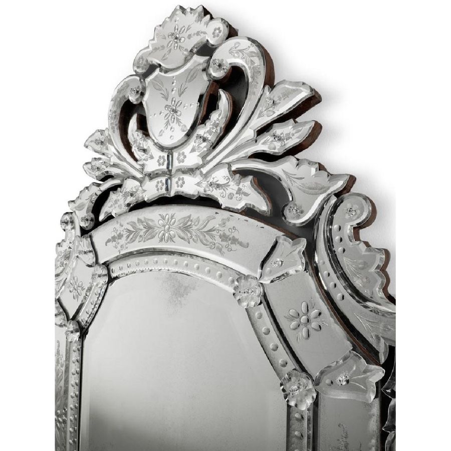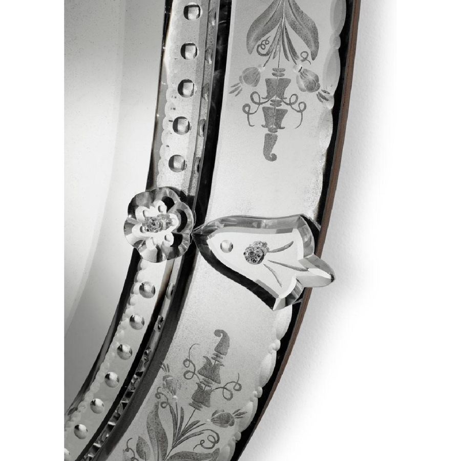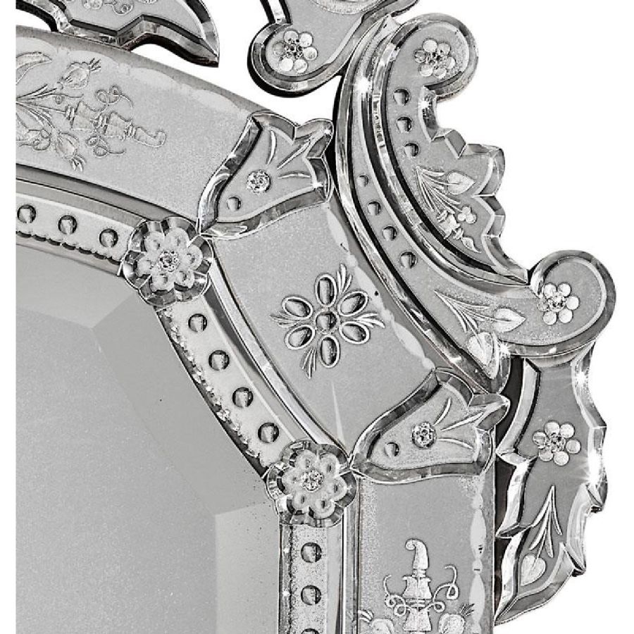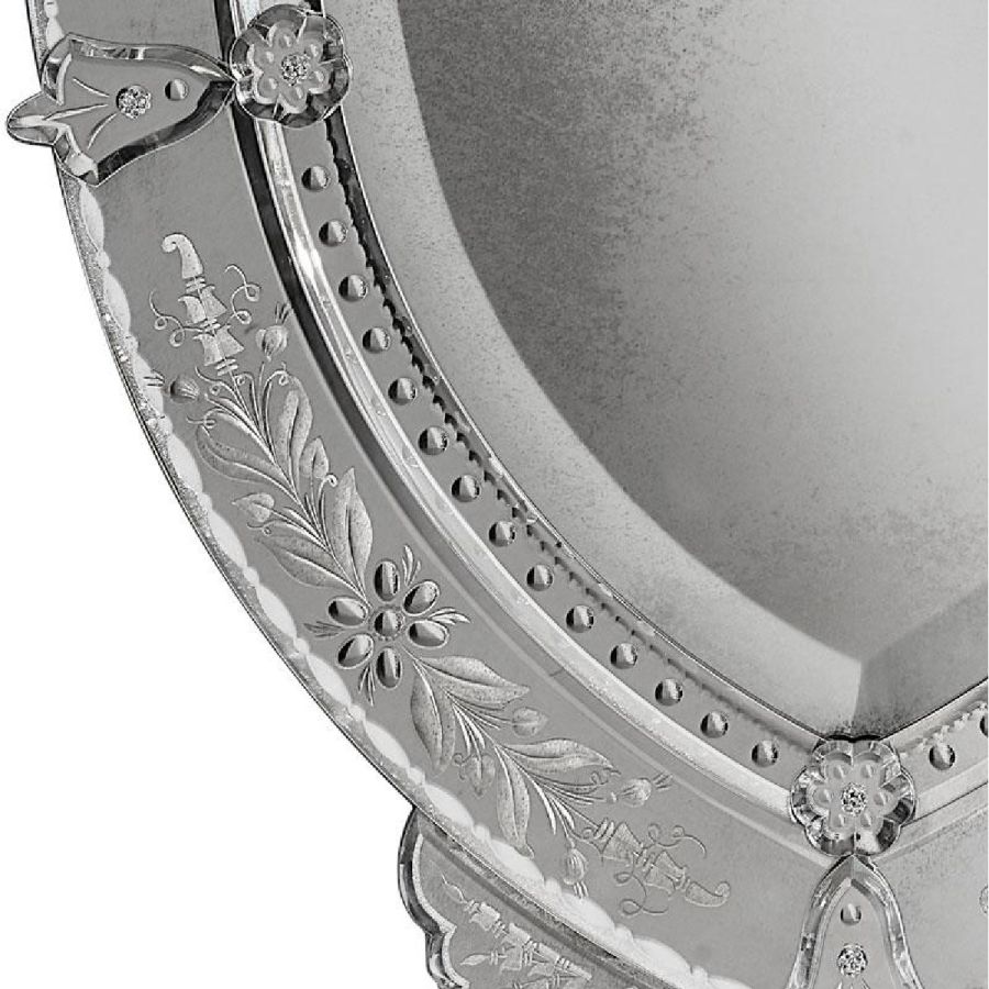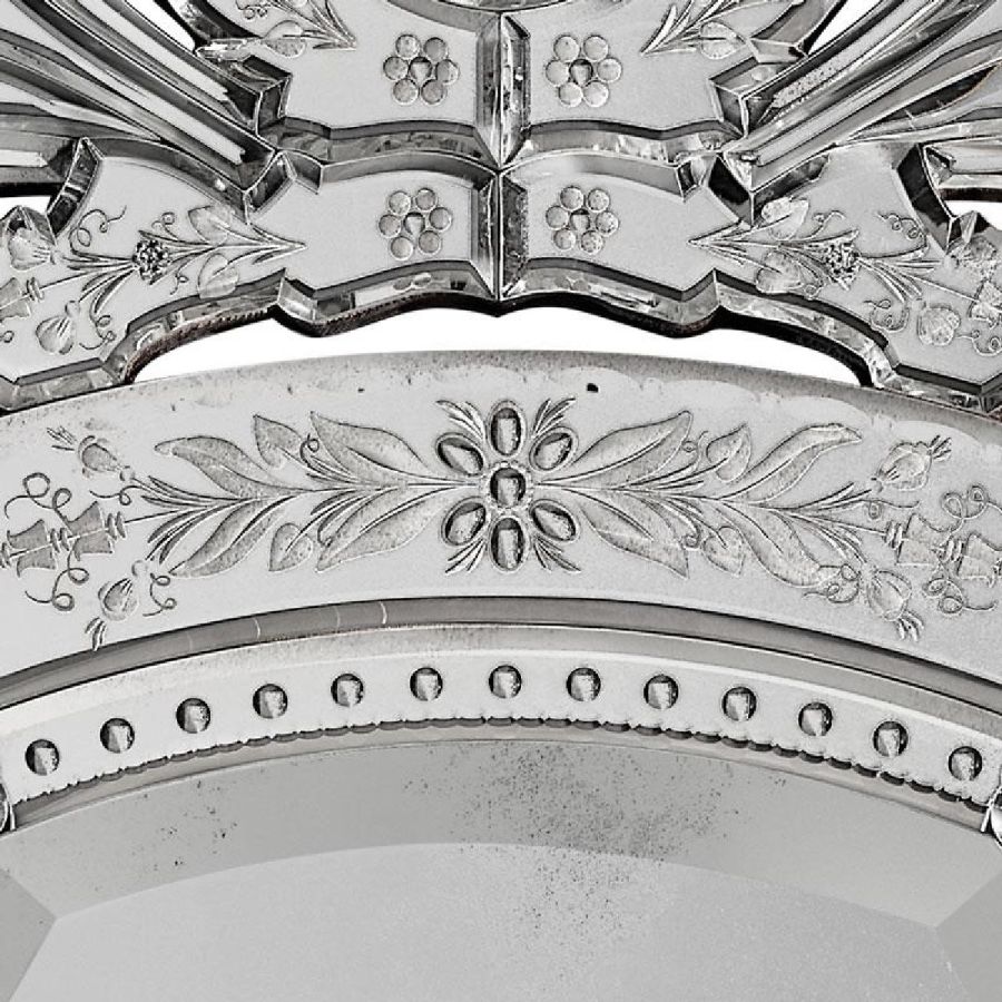 Frames with thumbnail-shaped etchings and crest made of bevelled and engraved glass with light antique mirrored finish.