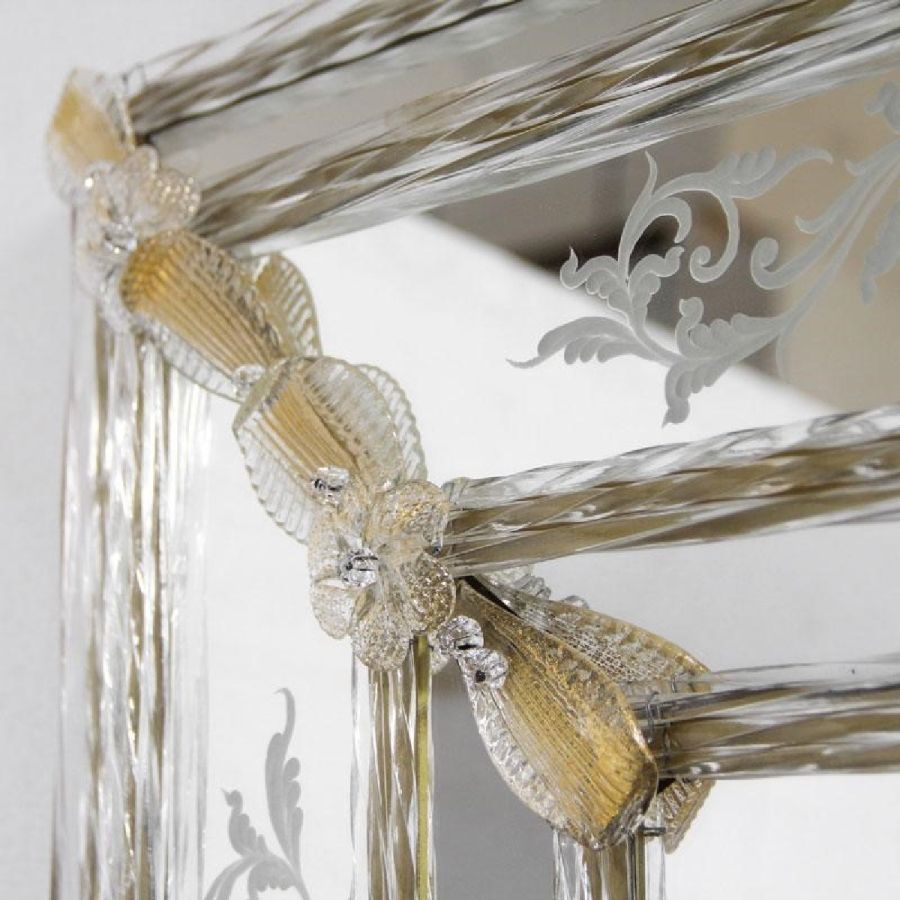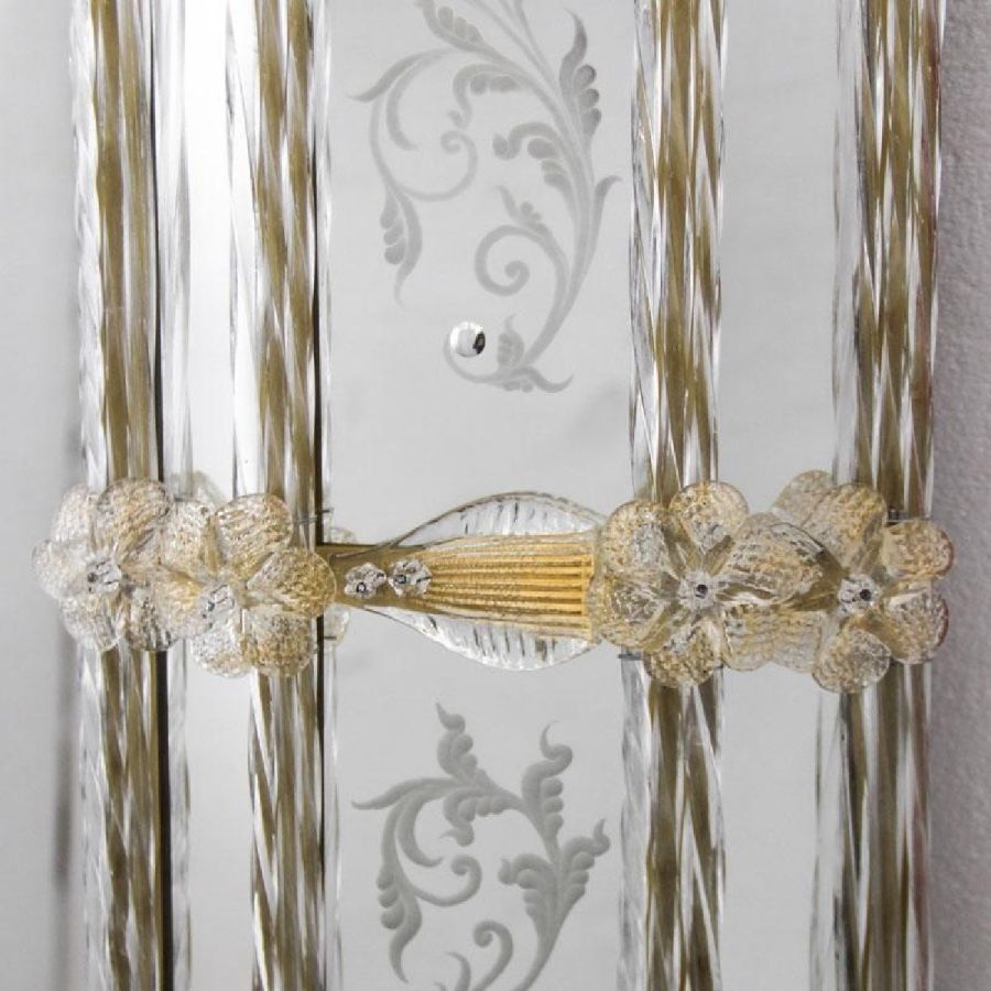 Floral motif engravings. Decorative leaves, rosettes and twisted ropes made of crystal and gold coloured Murano glass.
