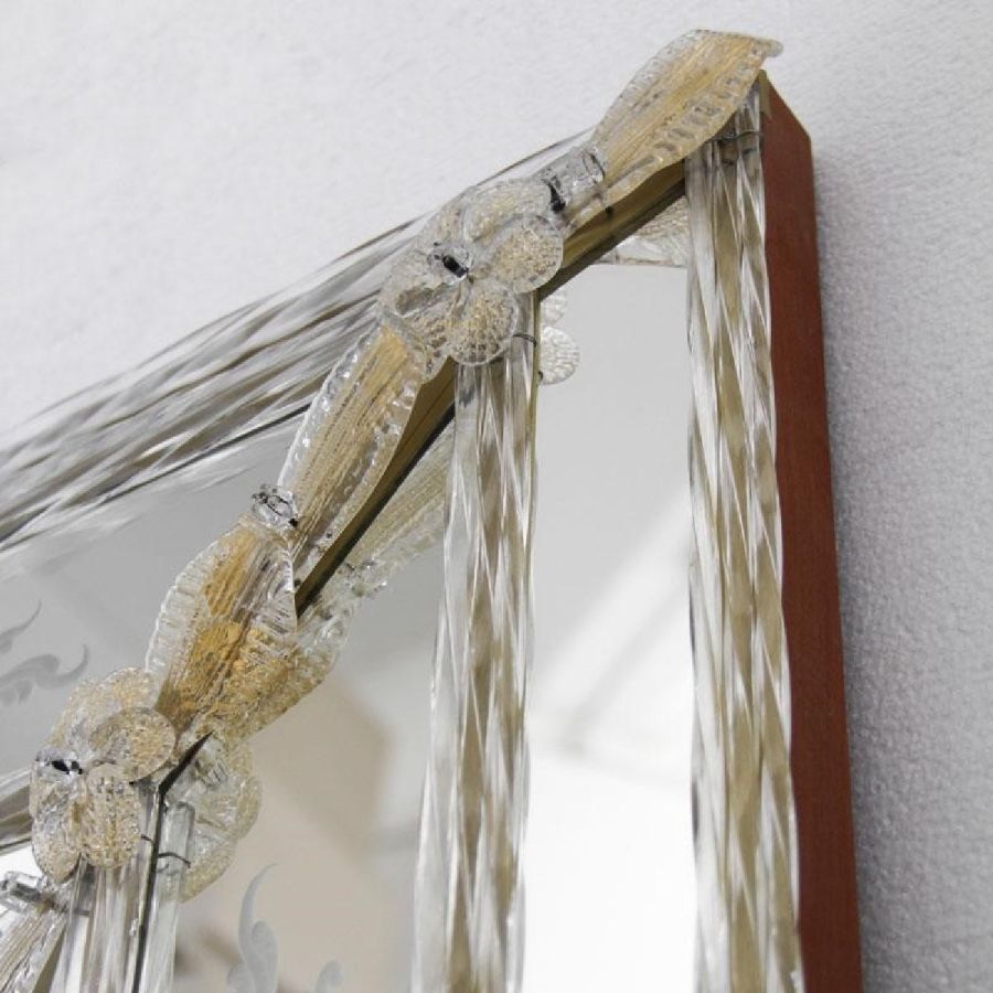 The most famous characters are the typical engraved curl finishings together with the depiction of Bacco, Justice or the well-known Venetian Eighteenth-century. Crystal colored Murano decorative flowers, leaves, twisted ropes and multicoloured glass paste rosettes embellish each Venetian mirror. The result is a unique item comparable to a work of art for craftsmanship and excellence in its execution.