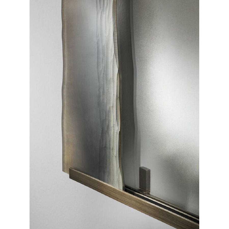 Brushed burnished brass metal profiles. Sliding baked glass panels decorated with Roddi and Barbaresco finishes, central glass partially mirrored.