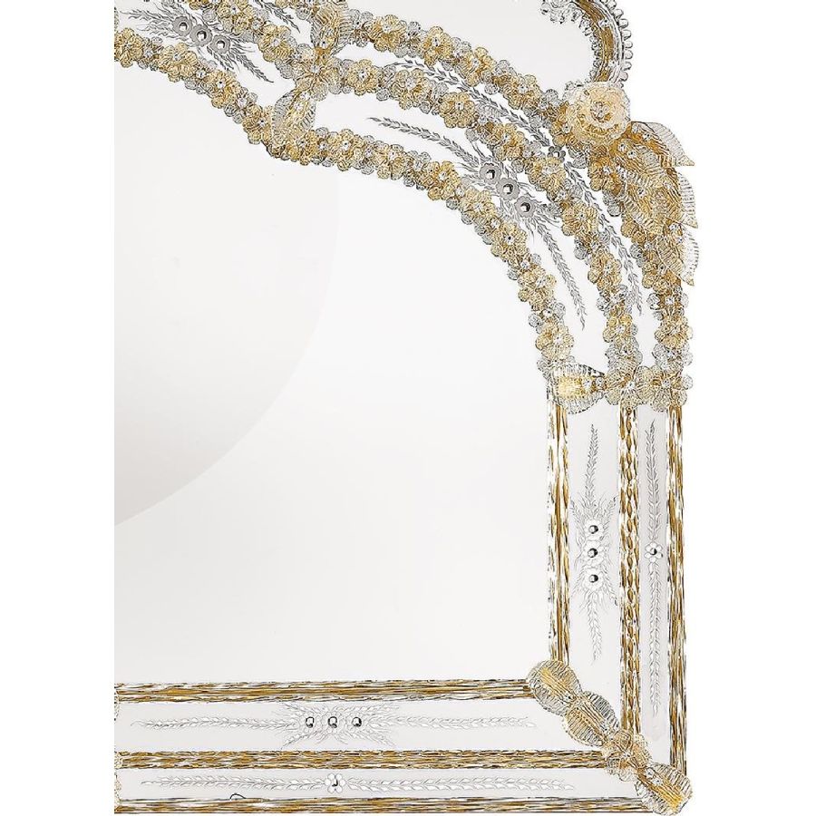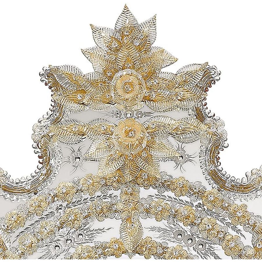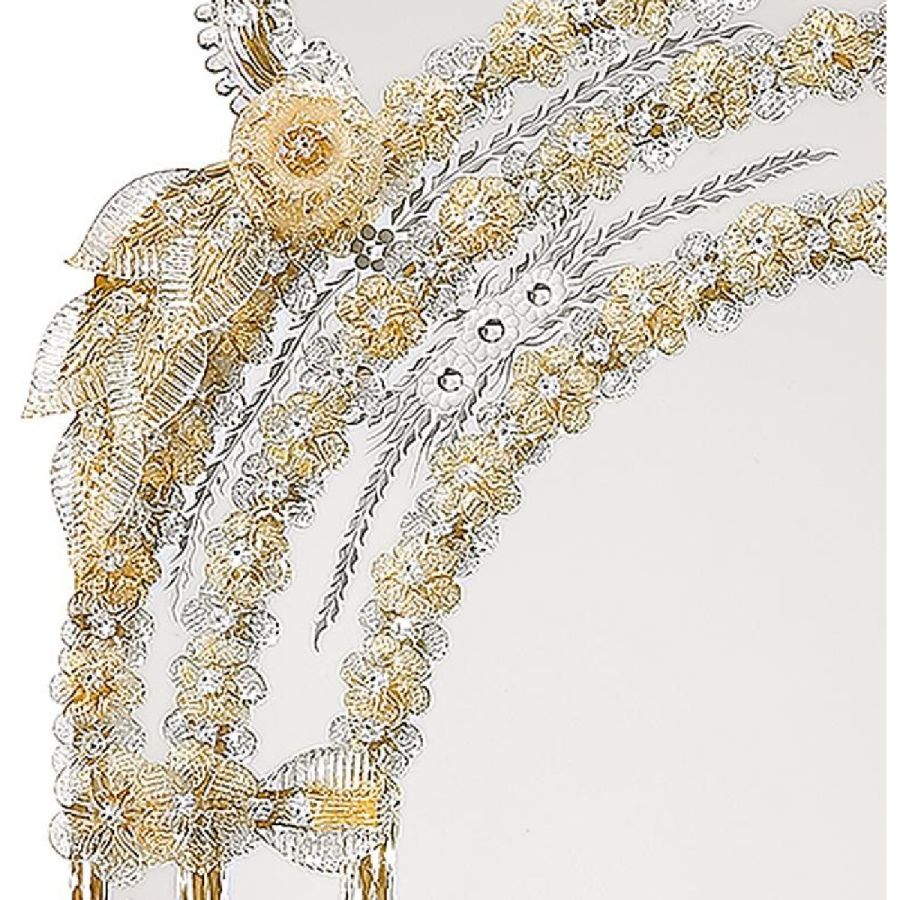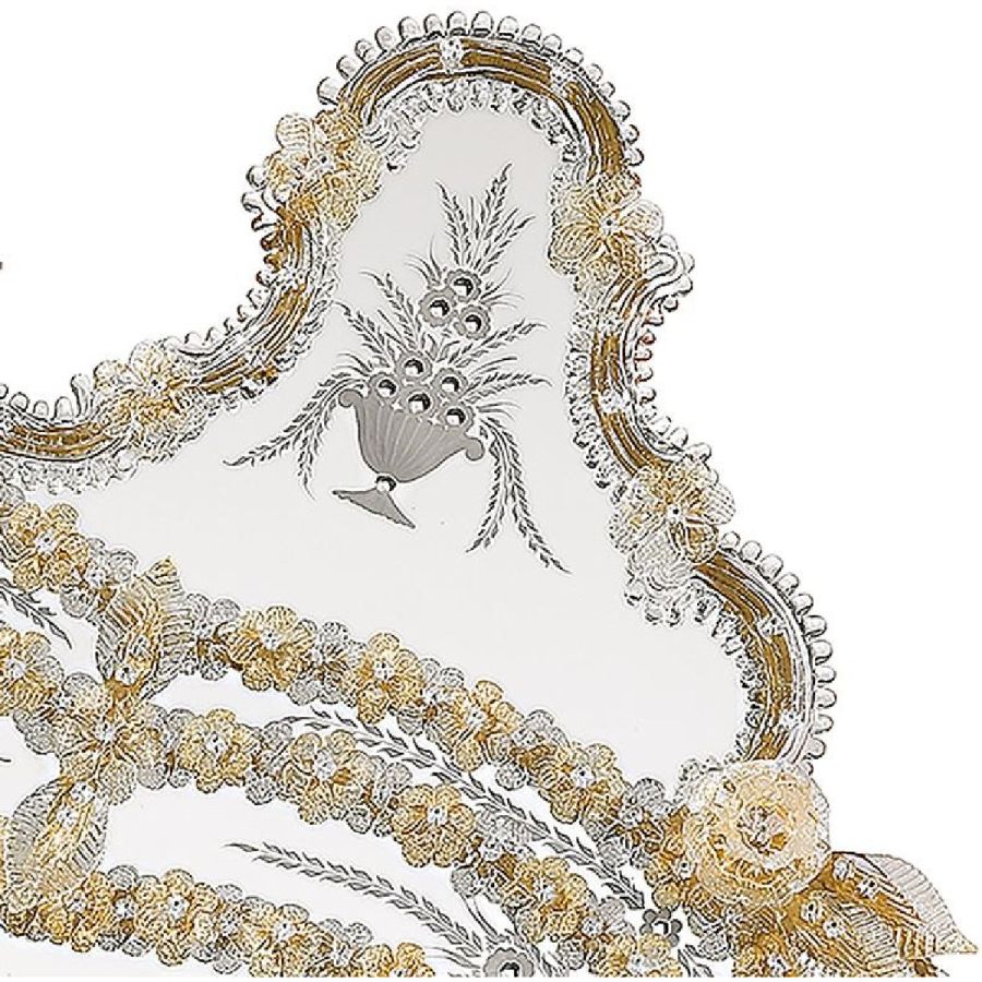 The most famous characters are the typical engraved curl finishings together with the depiction of Bacco, Justice or the well-know Venetian Eighteenth-century. Crystal colored Murano decorative flowers, leaves, twisted ropes and multicoloured glass paste rosettes embellish each Venetian mirror. The result is a unique item comparable to a work of art for craftsmanship and excellence in its execution.