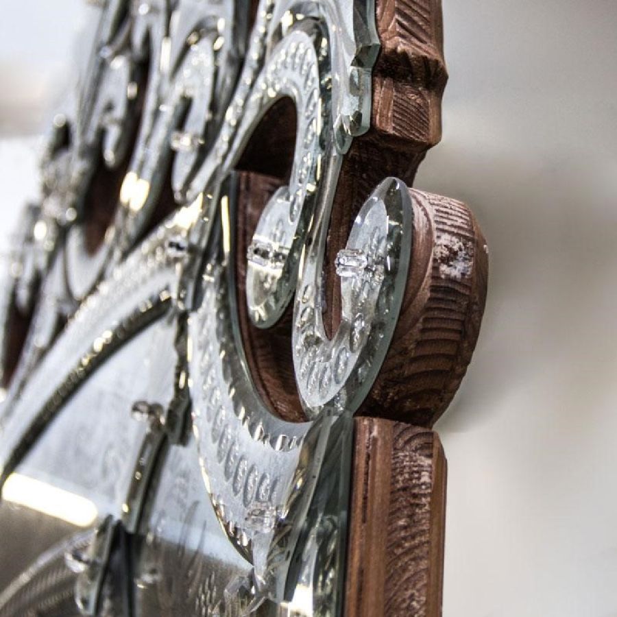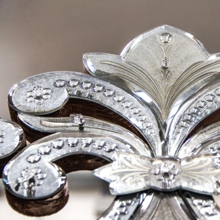 A French mirror is in fact made of lots of different bevelled pieces that are close together and create a harmonious geometrical figure. A beautiful example is, an iconic mirror by Arte Veneziana that is made of 412 hand bevelled pieces. The most visible difference between a Venetian and a French mirror is the total absence of hand-blown glass decorations on the latter.