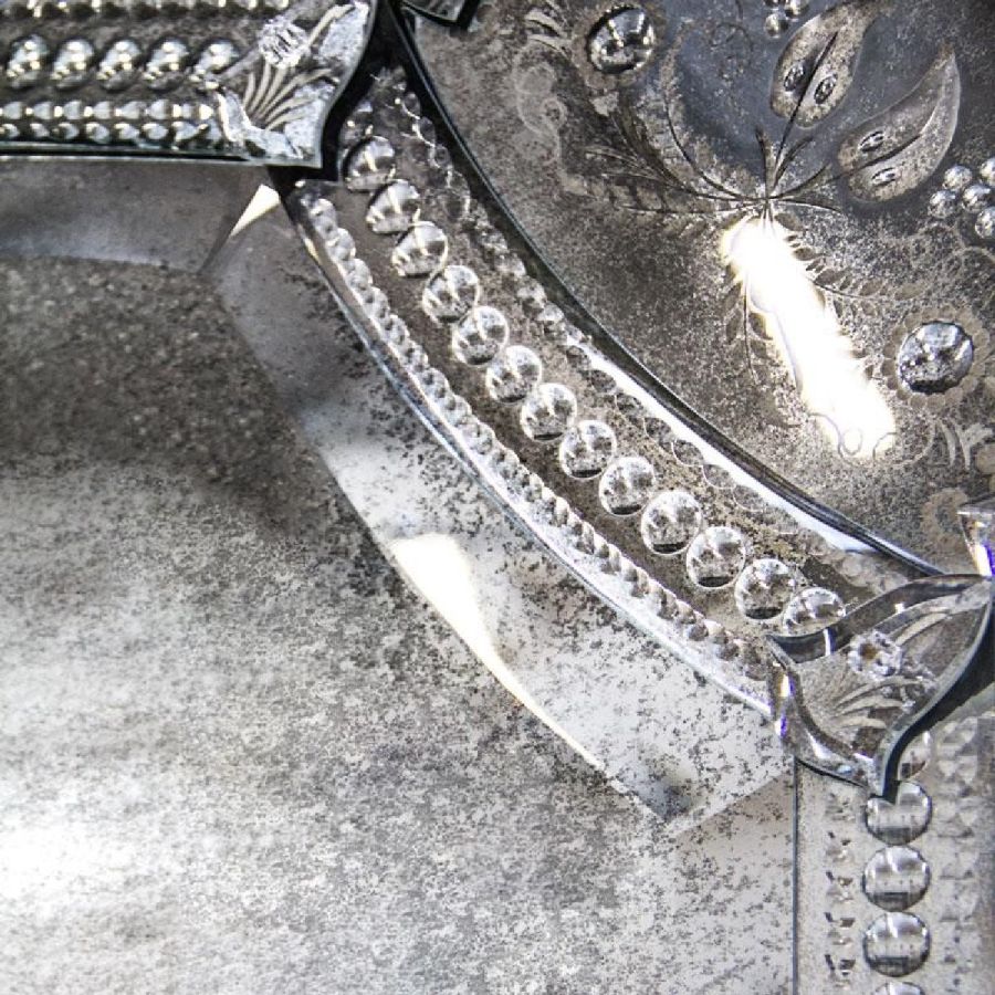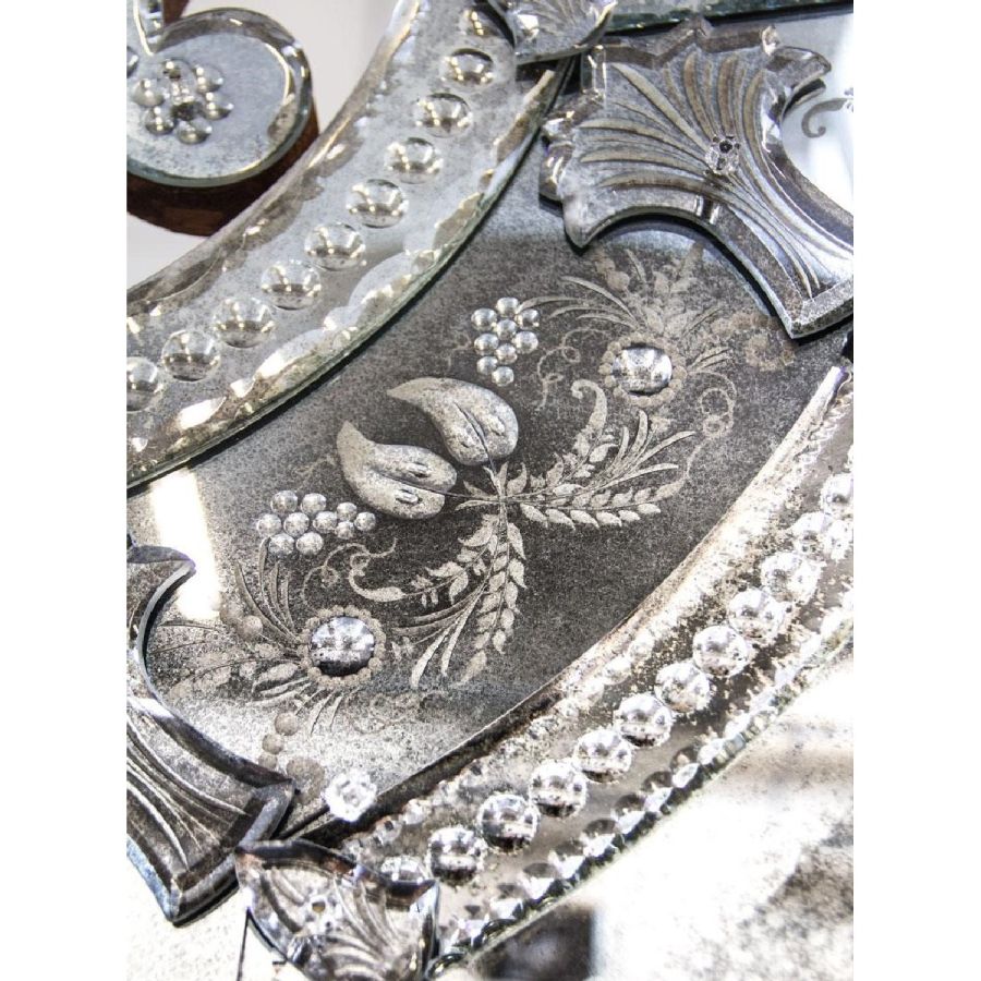 Frames with thumbnail-shaped etchings and crest made of bevelled and engraved glass with medium antique mirrored finish.