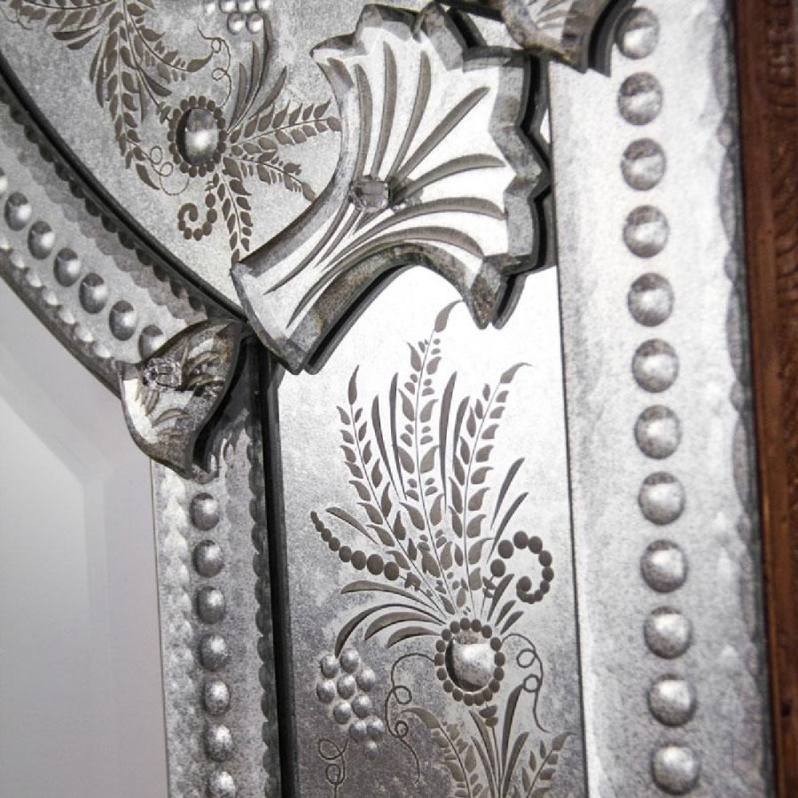 Frames with thumbnail-shaped etchings and crest made of bevelled and engraved glass with medium antique mirrored finish.
