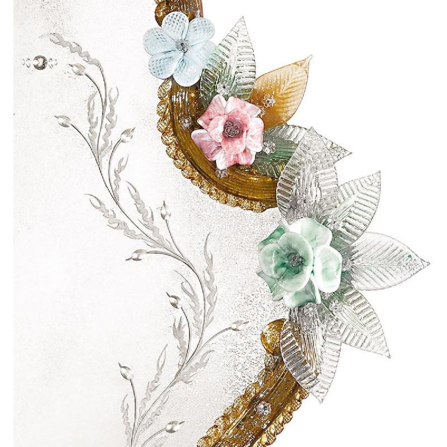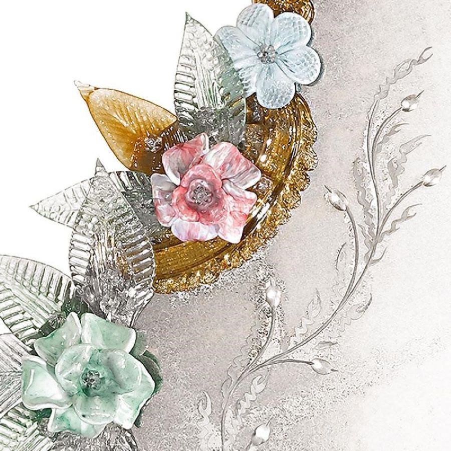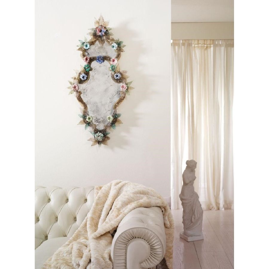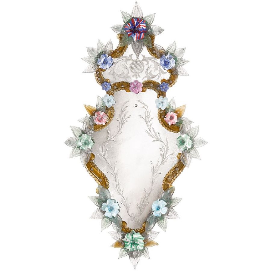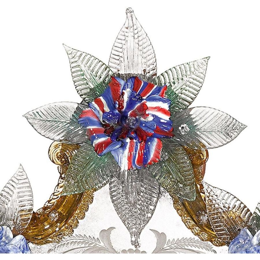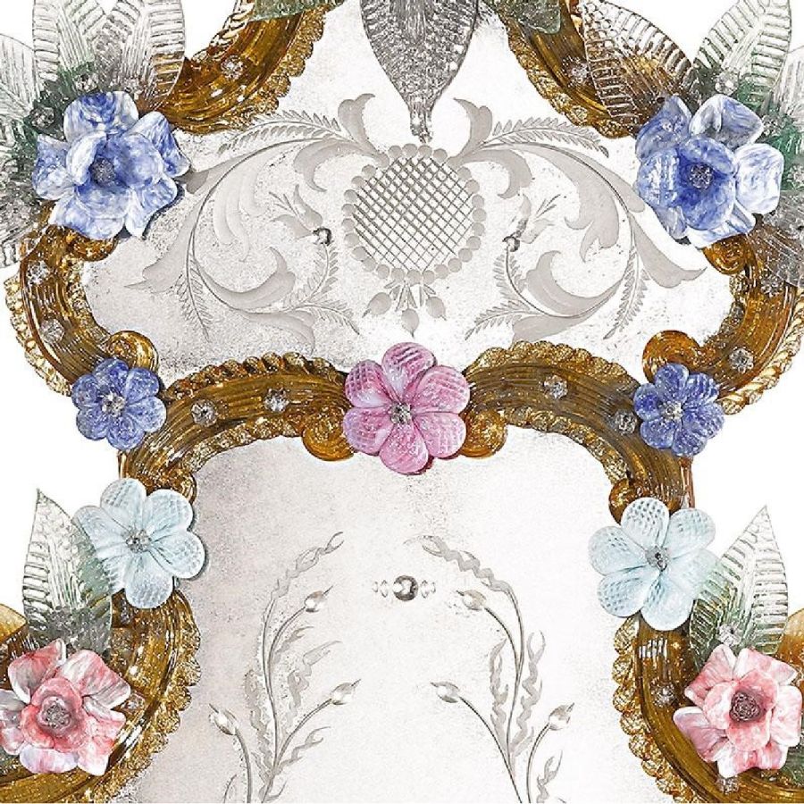 The most famous characters are the typical engraved curl finishings together with the depiction of Bacco, Justice or the well-know Venetian Eighteenth-century. Crystal colored Murano decorative flowers, leaves, twisted ropes and multicoloured glass paste rosettes embellish each Venetian mirror. The result is a unique item comparable to a work of art for craftsmanship and excellence in its execution.