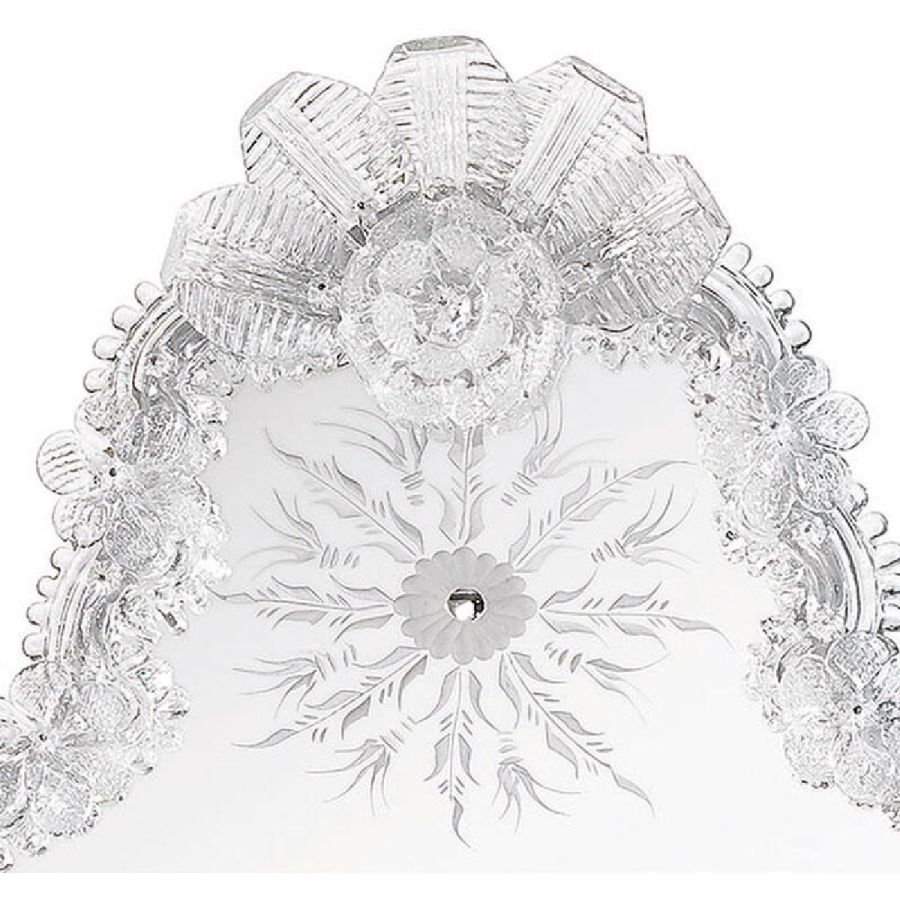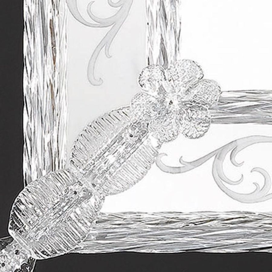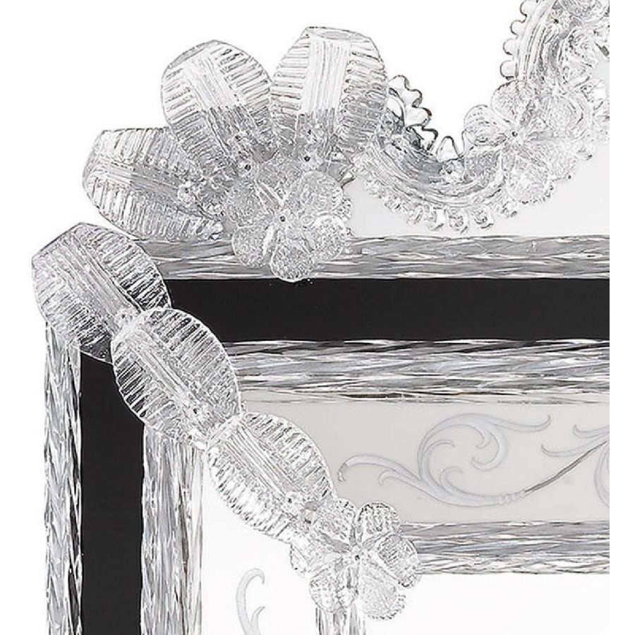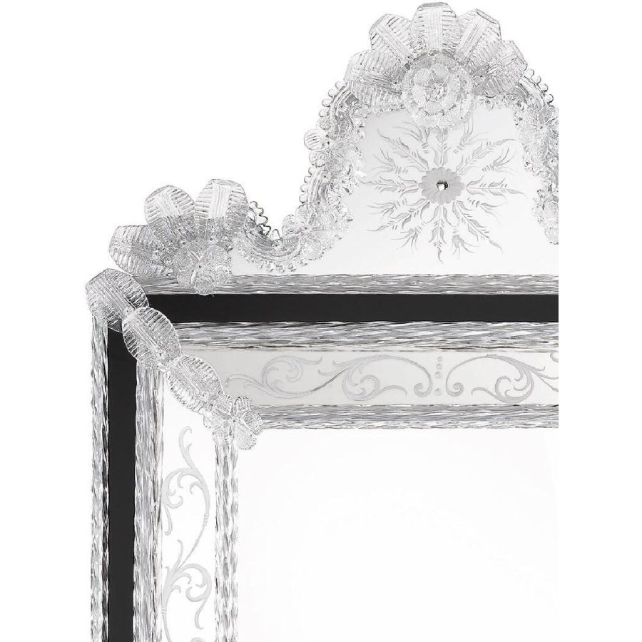 The most famous characters are the typical engraved curl finishings together with the depiction of Bacco, Justice or the well-known Venetian Eighteenth-century. Crystal colored Murano decorative flowers, leaves, twisted ropes and multicoloured glass paste rosettes embellish each Venetian mirror. The result is a unique item comparable to a work of art for craftsmanship and excellence in its execution.