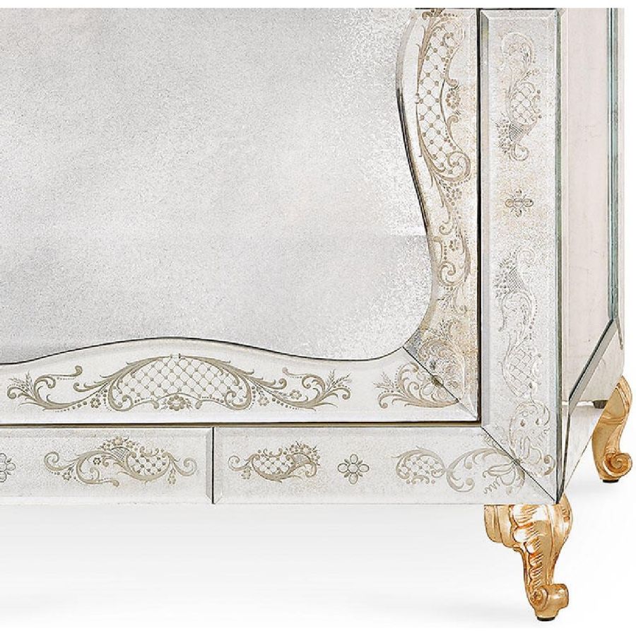 Doors and sides made of medium antique mirrored glass. Frames made of bevelled and engraved glass with medium antique mirrored finish.