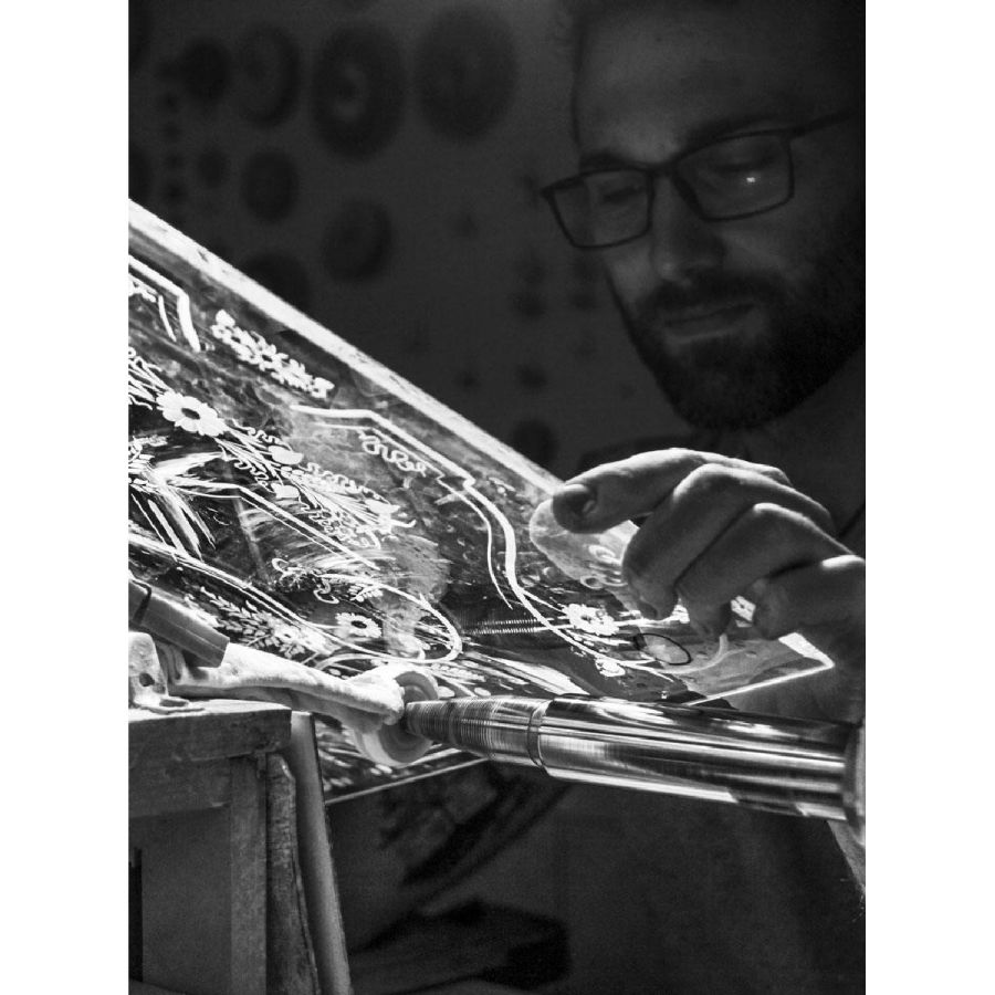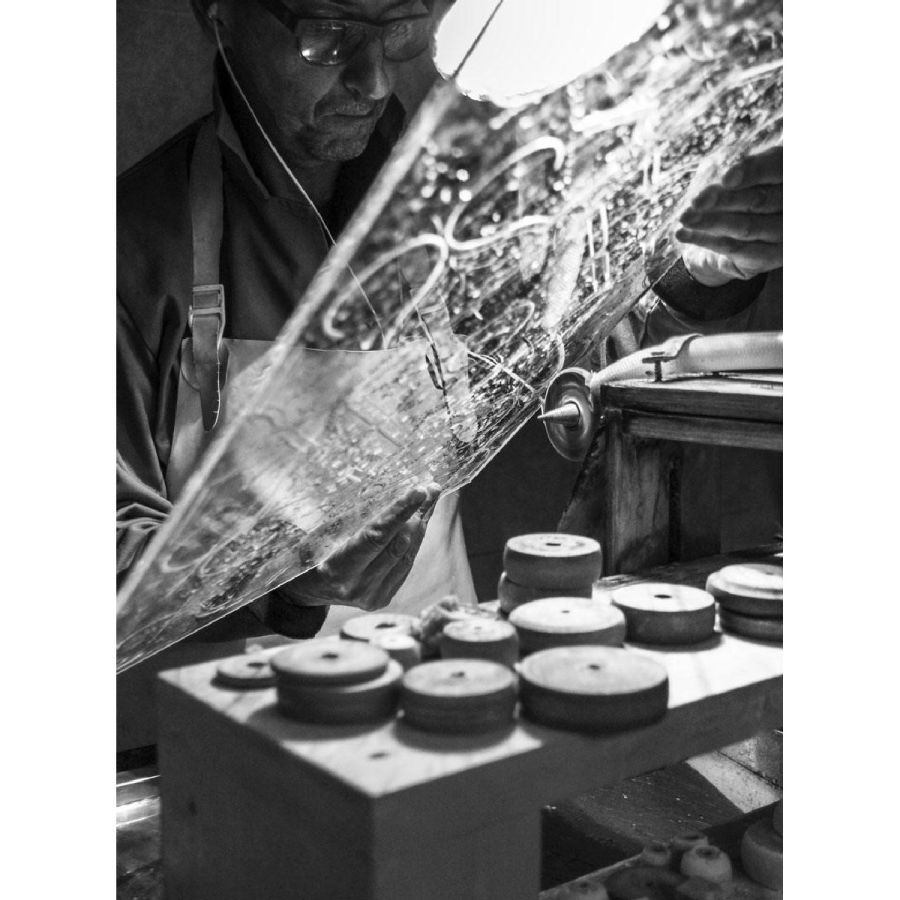Glass engraving is a process which requires great mastery and creativity in the drawing, as well as ability in performing the engraving and choosing the appropriate grinding wheel.