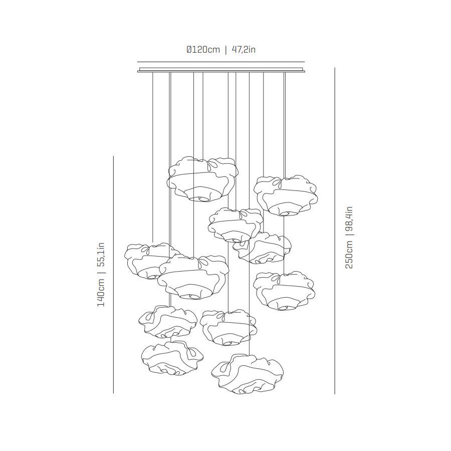 Kombinationen av lampor i alla storlekar i en komposition presenterar de oåterupprepbara organiska former som kännetecknar kollektionen designad av Arturo Alvarez. Dess handgjorda kurvor gör varje lampa unik och skild från alla andra. Det är volymer som tycks vara levande, i ständig utveckling och rörelse, både på grund av sin form och på grund av de veck genom vilka ljuset sprids.