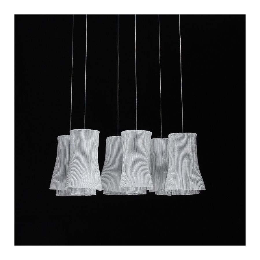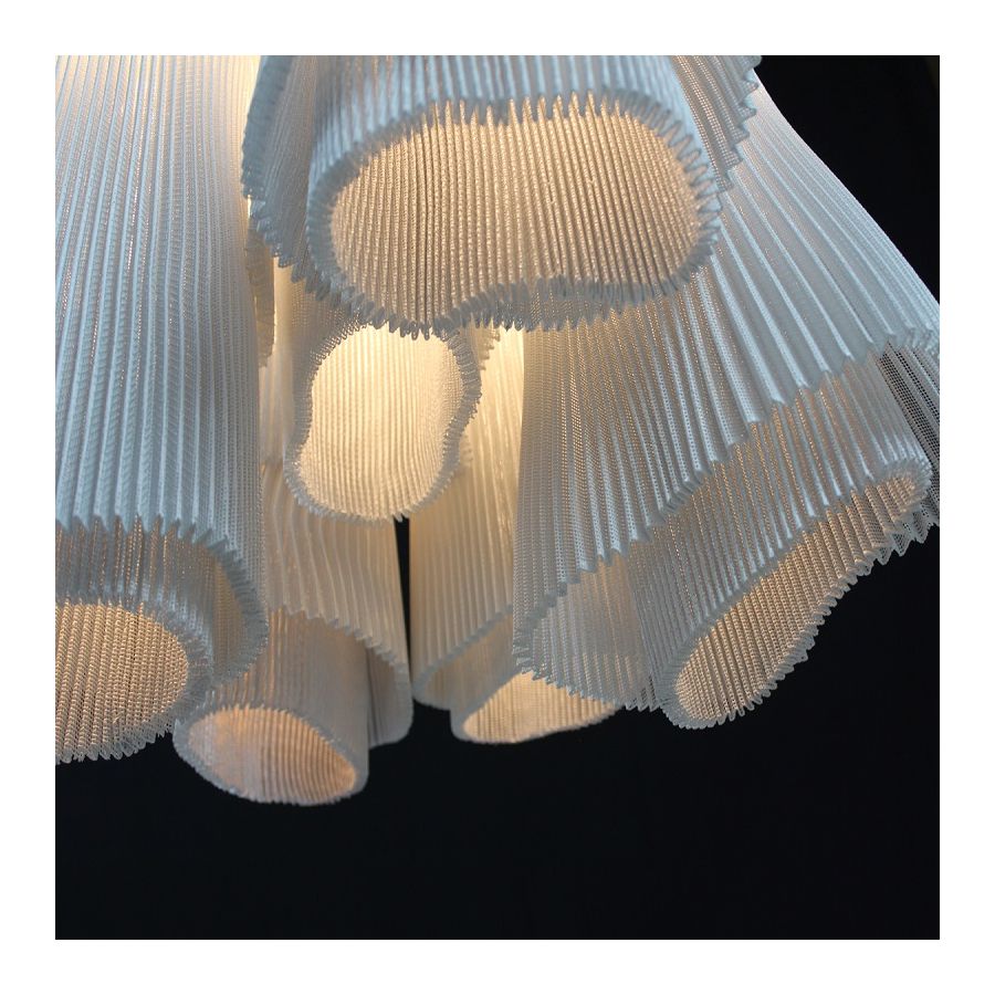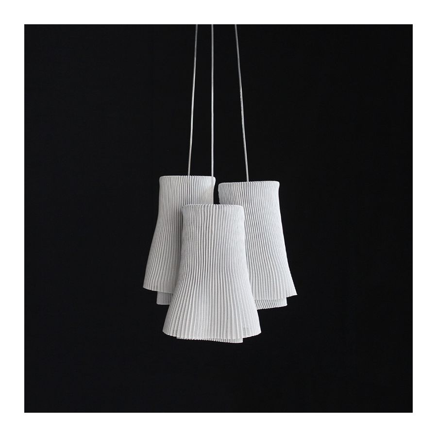 Tempo är en kollektion pendellampor tillverkad med målat rostfritt stålnät. Detta material, format i fina veck, bildar två överlappande lager som skapar två olika lampor fulla av dynamik. Andante och Vivace, två livfulla former födda ur en. Representationen av två ögonblick som genereras av samma rörelse i ett annat tempo.