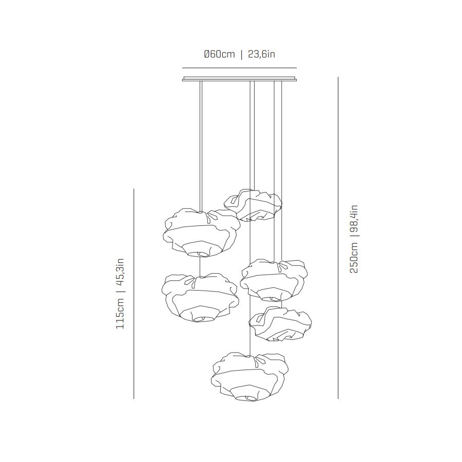 Kombinationen av lampor i alla storlekar i en komposition presenterar de oåterupprepbara organiska former som är karaktäristiska för kollektionen designad av Arturo Alvarez. Dess handgjorda kurvor gör varje lampa unik och annorlunda än alla andra. Det är volymer som tycks vara levande, i ständig utveckling och rörelse, både i sin form och i de veck genom vilka ljuset sprider sig.