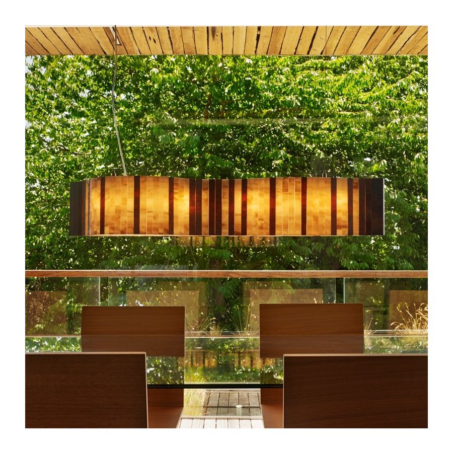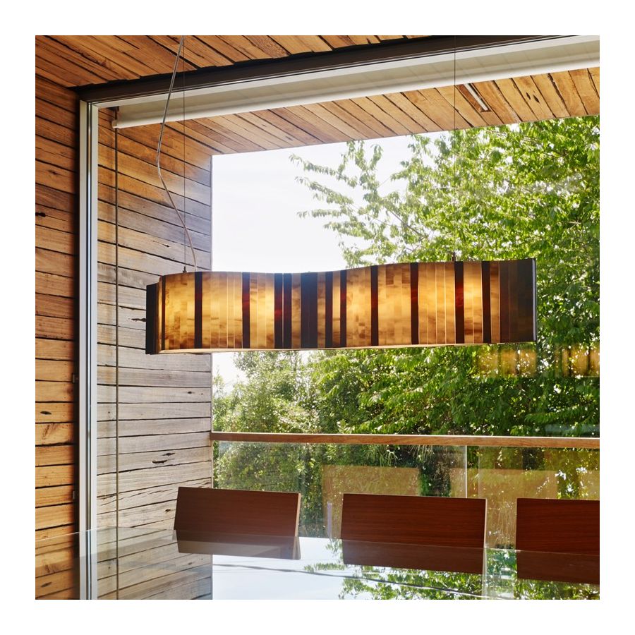 Denna glaskollektion erinrar om den slingrande rörelsen av en lätt bris. Dessa eleganta lampor, tillverkade av en följd av små glaskivor, uppställda i en böjd linje; förmedlar lugn och sinnesro, leder varje blick med renheten i sina former och de subtila färgkombinationerna i kollektionen.