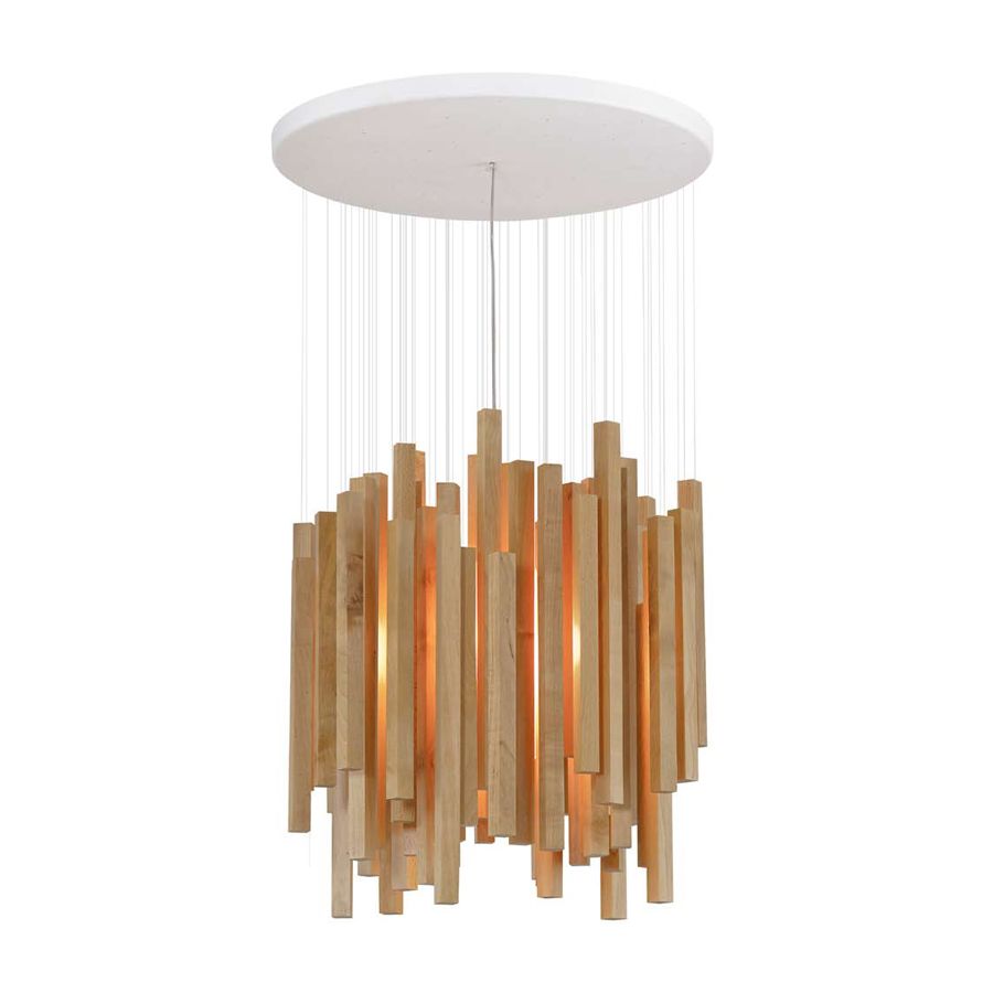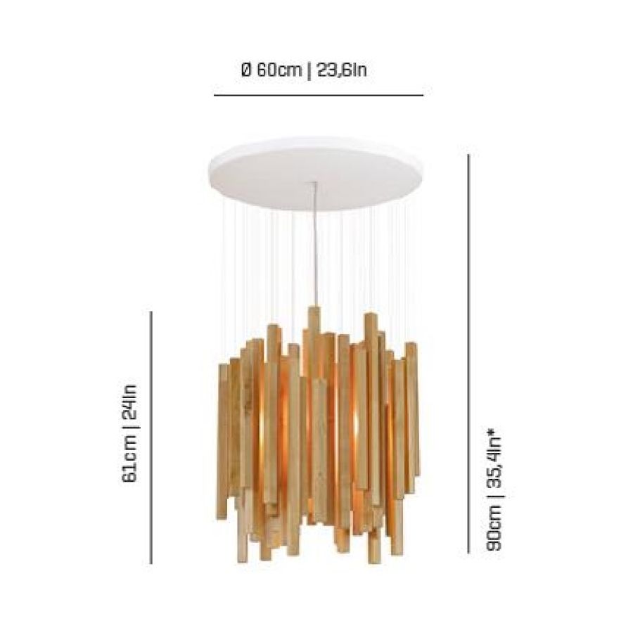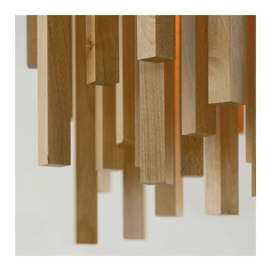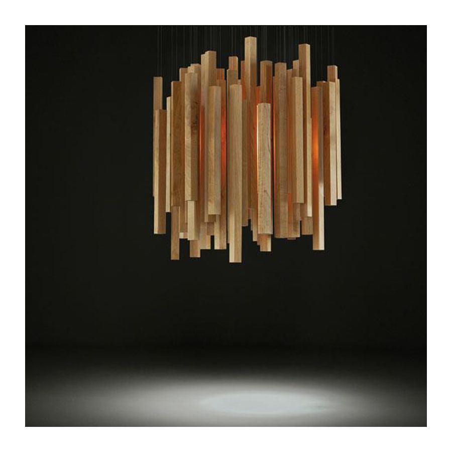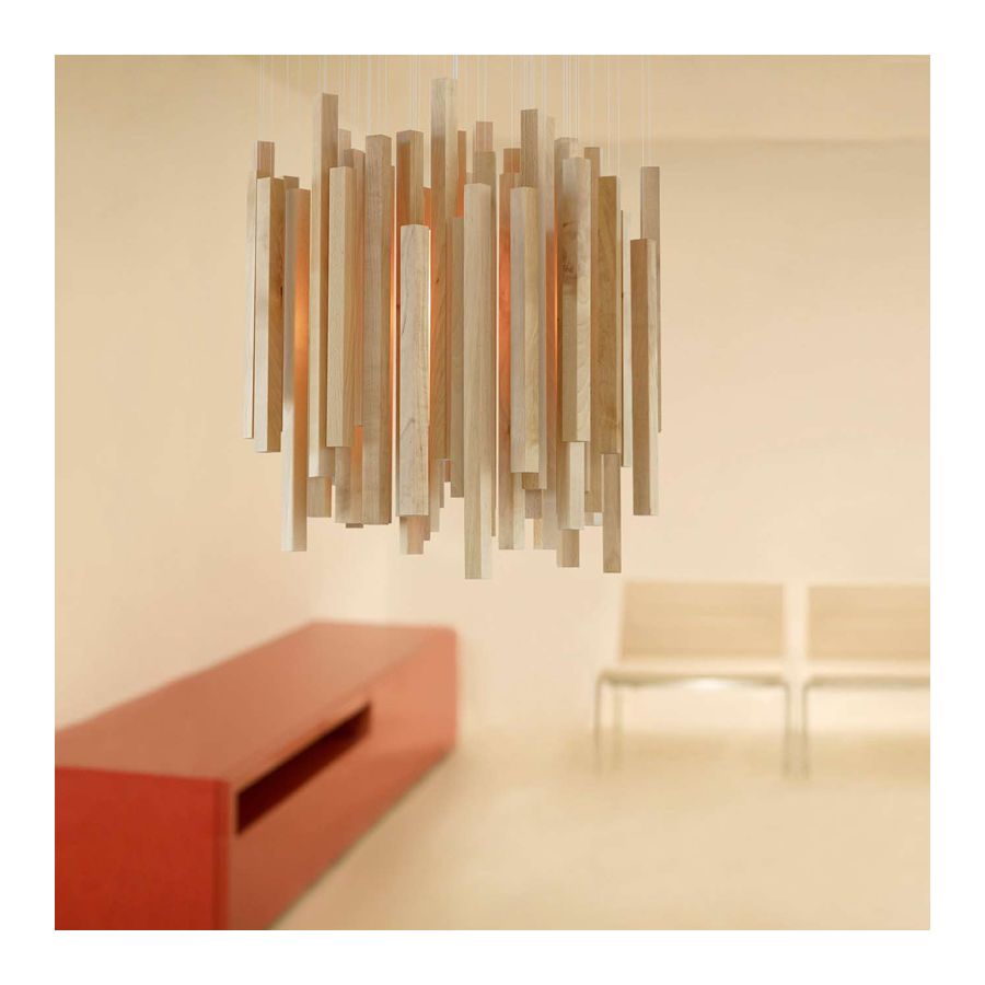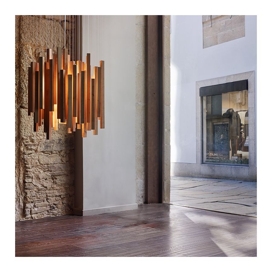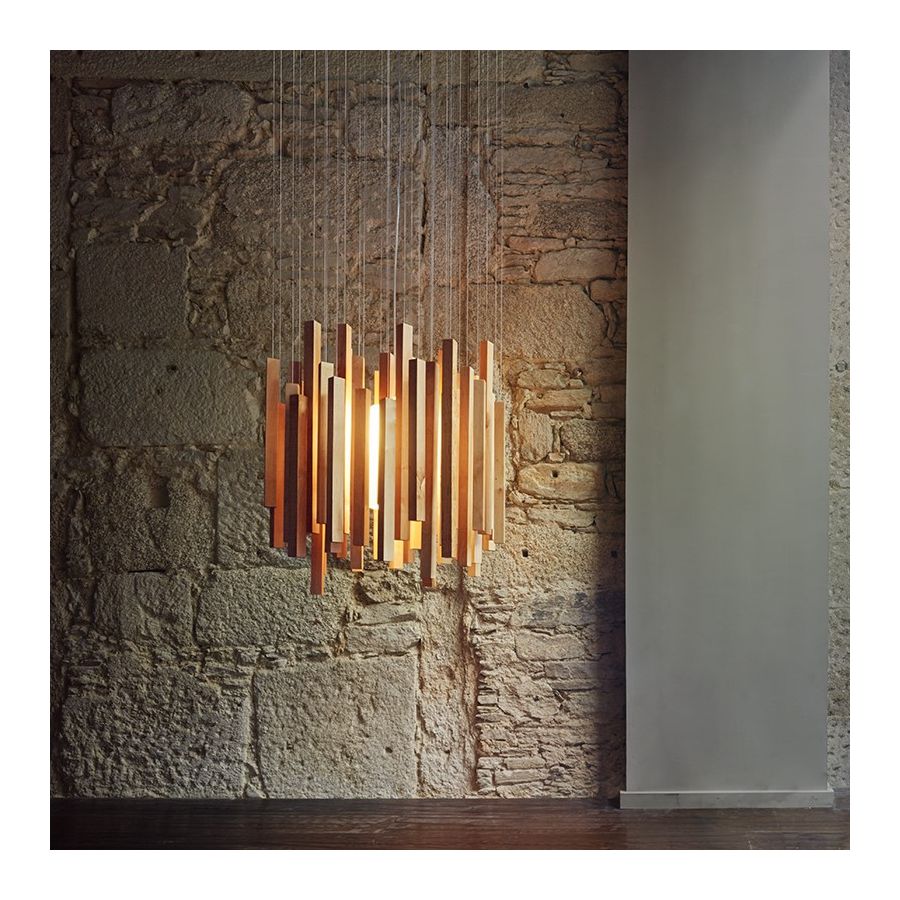 Designad av Héctor Serrano, denna pendellampa, gjord med upphängda träbitar, återskapar magin i en skog när ljuset flödar bland dess träd. En harmonisk grupp av vertikala linjer på olika höjder som skapar ett omslutande spel av ljus och skuggor. Träets naturlighet ger denna lampa, med återhållsamma linjer, elegans och värme, som om den väntade på vinden i en lugn stillhet.