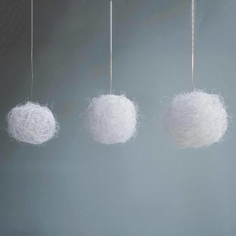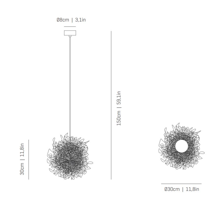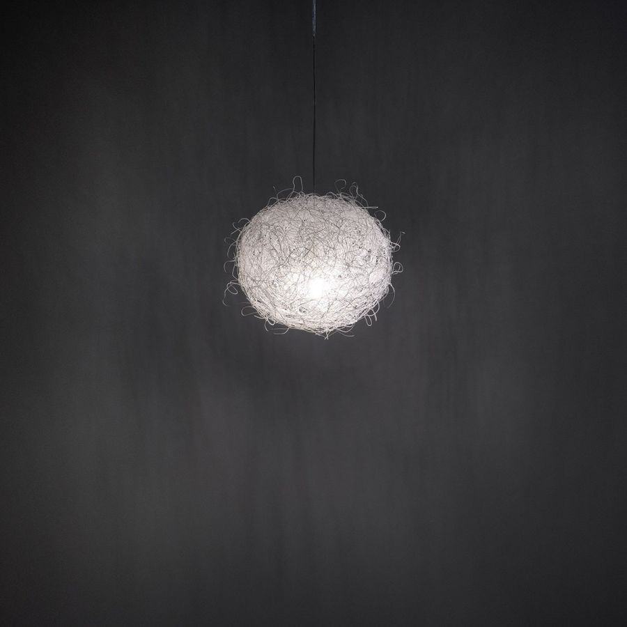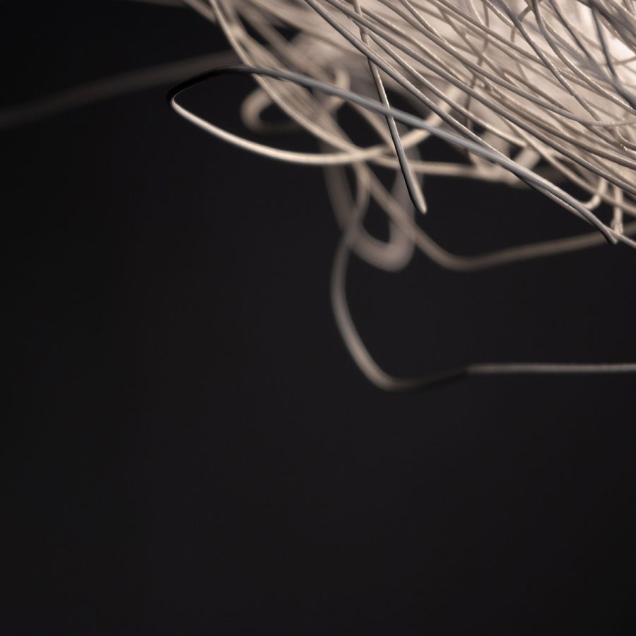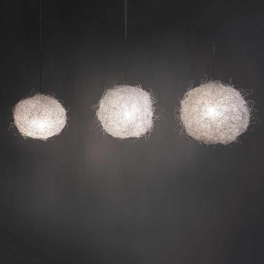 Den PILI mini pendellampan är en enda tråd av målat rostfritt stål som sammanflätas och skapar slumpmässiga volymer utan ordning, och väver en harmonisk och omslutande oregelbundenhet full av charm och mystik. Detta nystan genom vilket ljuset sipprar ut är handgjort i Spanien. Kollektionen presenteras i 3 lampstorlekar som låter dig skapa kompositioner med stor visuell effekt.