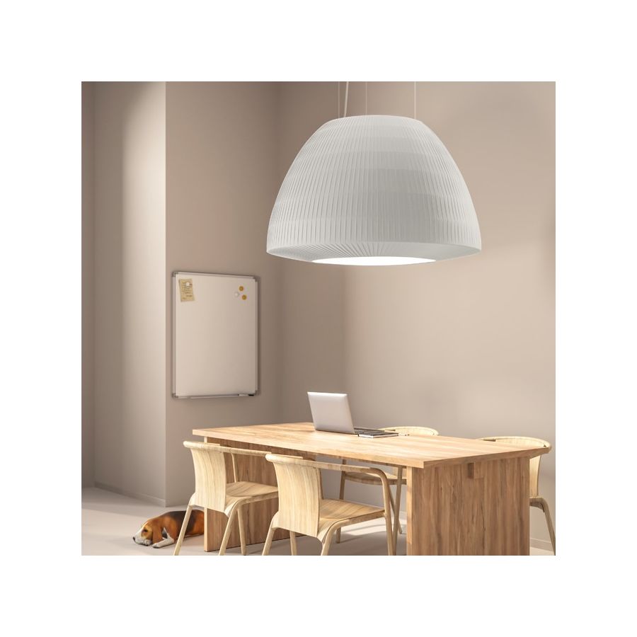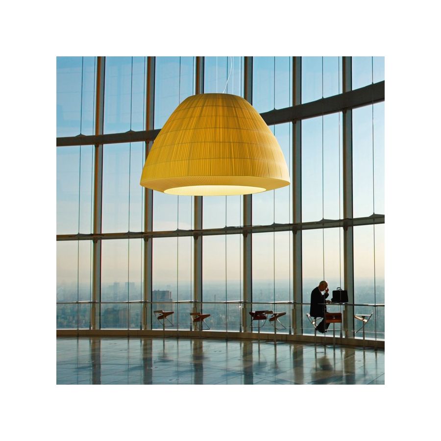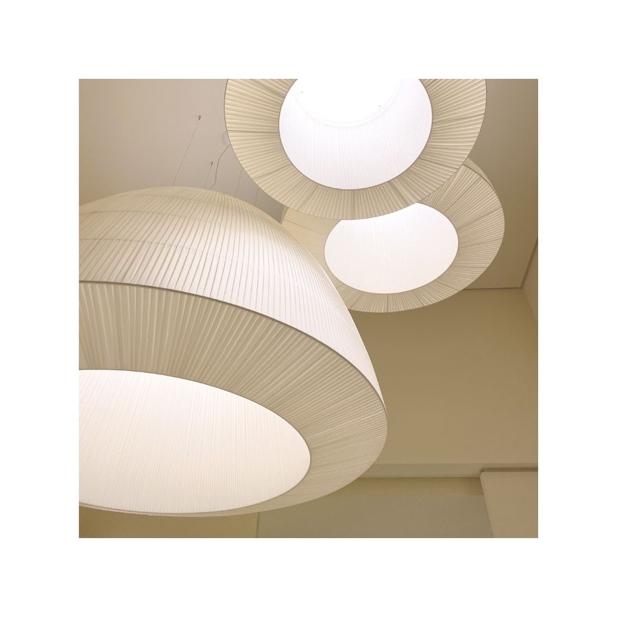 Bell’s soft lines and refined pongé fabric create a timeless design, blending understated elegance with versatility. Even in larger sizes, it remains visually light, enhancing spaces without overwhelming them. Its diffused, enveloping light, along with a range of colors and sizes, allows for full customization. The collection includes suspension, wall, ceiling, and floor lamps, fitting spaces of any scale.