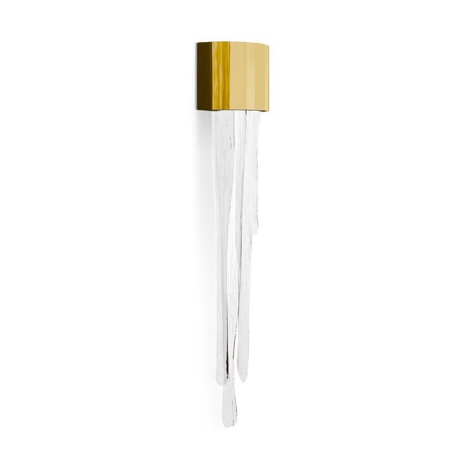 Babel emerges as a wall lighting solution in a single gold-plated brass ring with the magnificent, distinctive shape of crystal glass. Its design will add a sophisticated touch to any interior decor. Ideal to use as a single item or in harmony with more decorative elements.