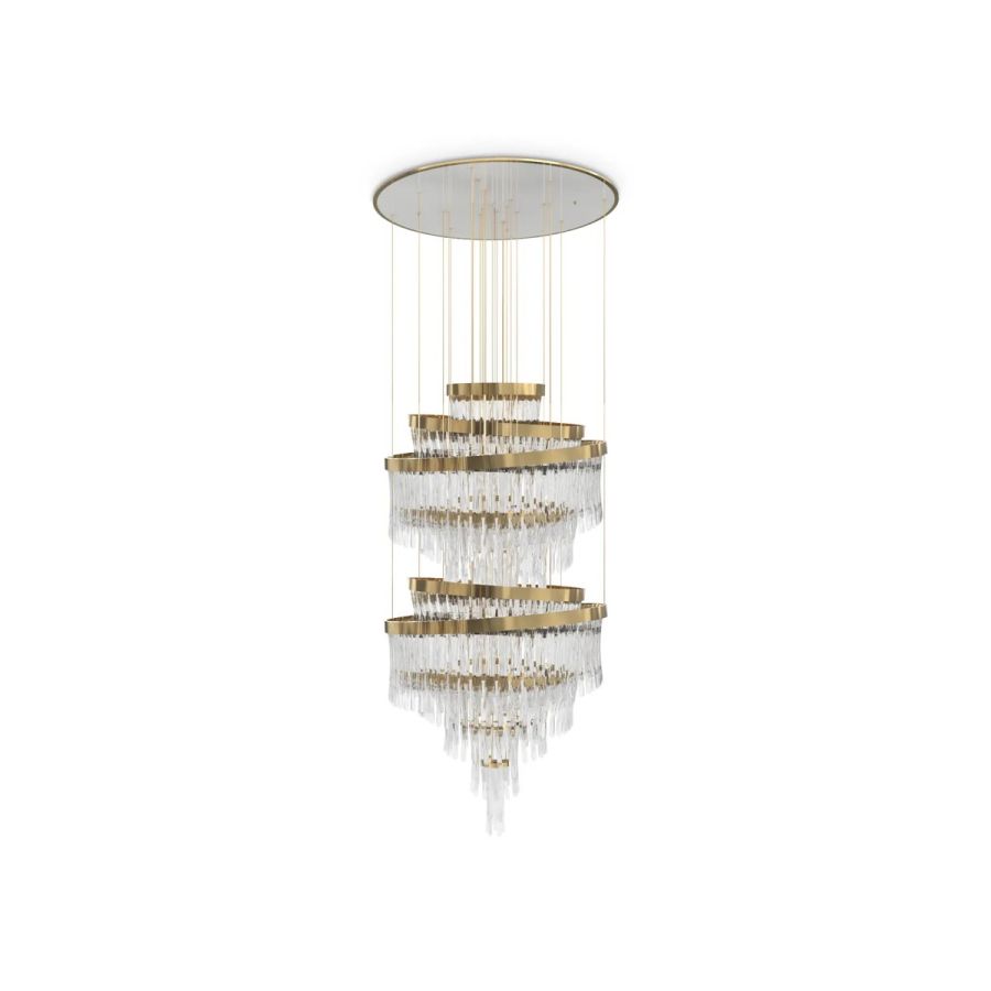 Described as a masterpiece of design, the Babel Chandelier XL is the perfect centerpiece that will illuminate every setting perfectly. Shaped with a downfall of handmade crystal glass and gold-plated brass, it creates exclusive patterns of lighting reflecting on the surroundings.