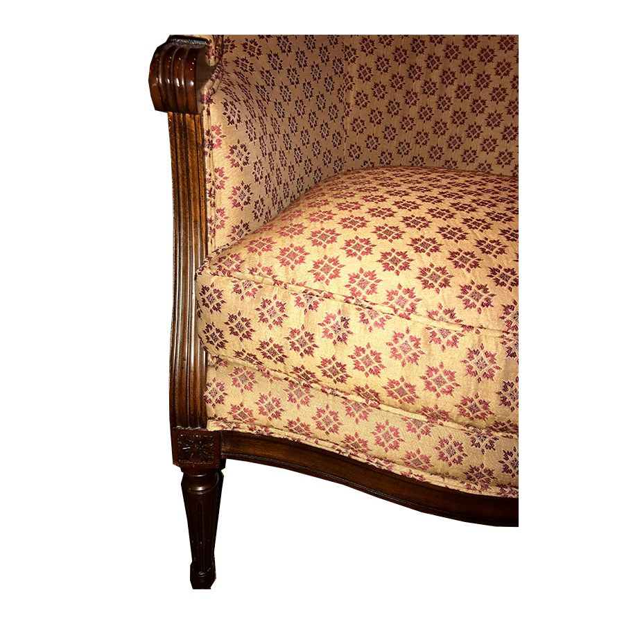 Upholstery: Premium showroom fabric in a warm red-burgundy tone, dressed with crisp seams and classic piping.