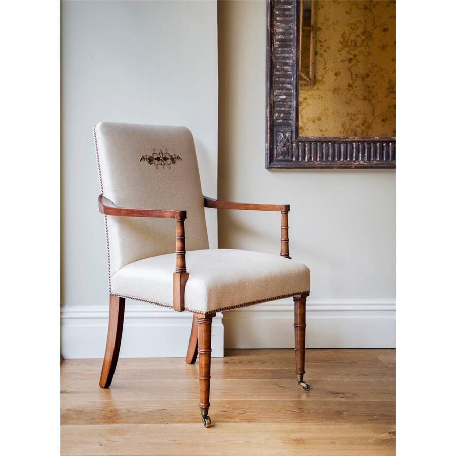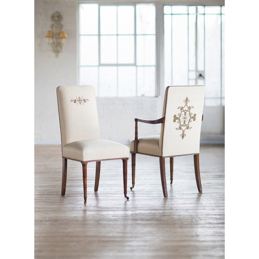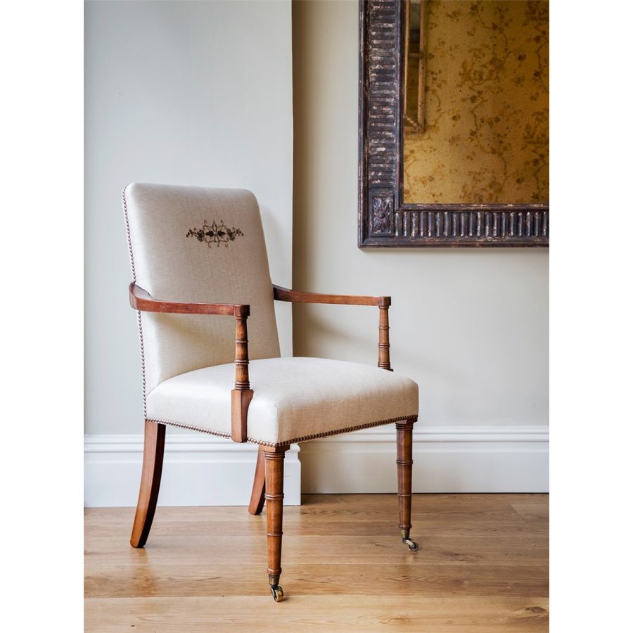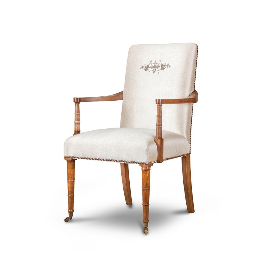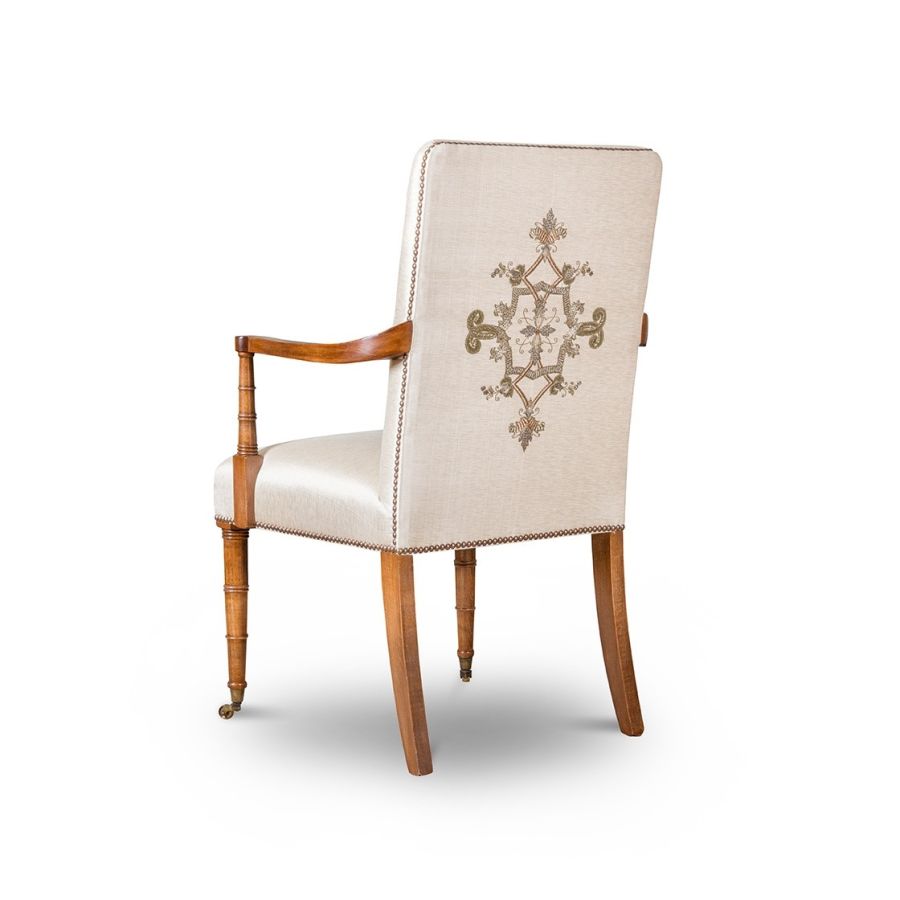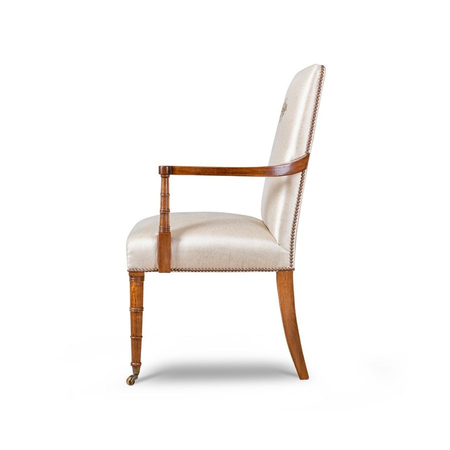 The Regency inspired Pavilion carver works beautifully as a dining chair or occasional piece. Available as a side chair and with turned faux-bamboo or plain square carved legs.
