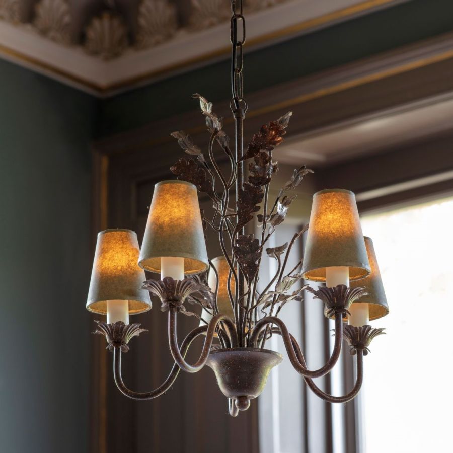 The enchanting little Oakleaf chandelier has five elegant scrolling arms enhanced by delicate branches with intertwined leaves radiating from the centre. It is the perfect companion to our Oakleaf and Woodbury wall lights.