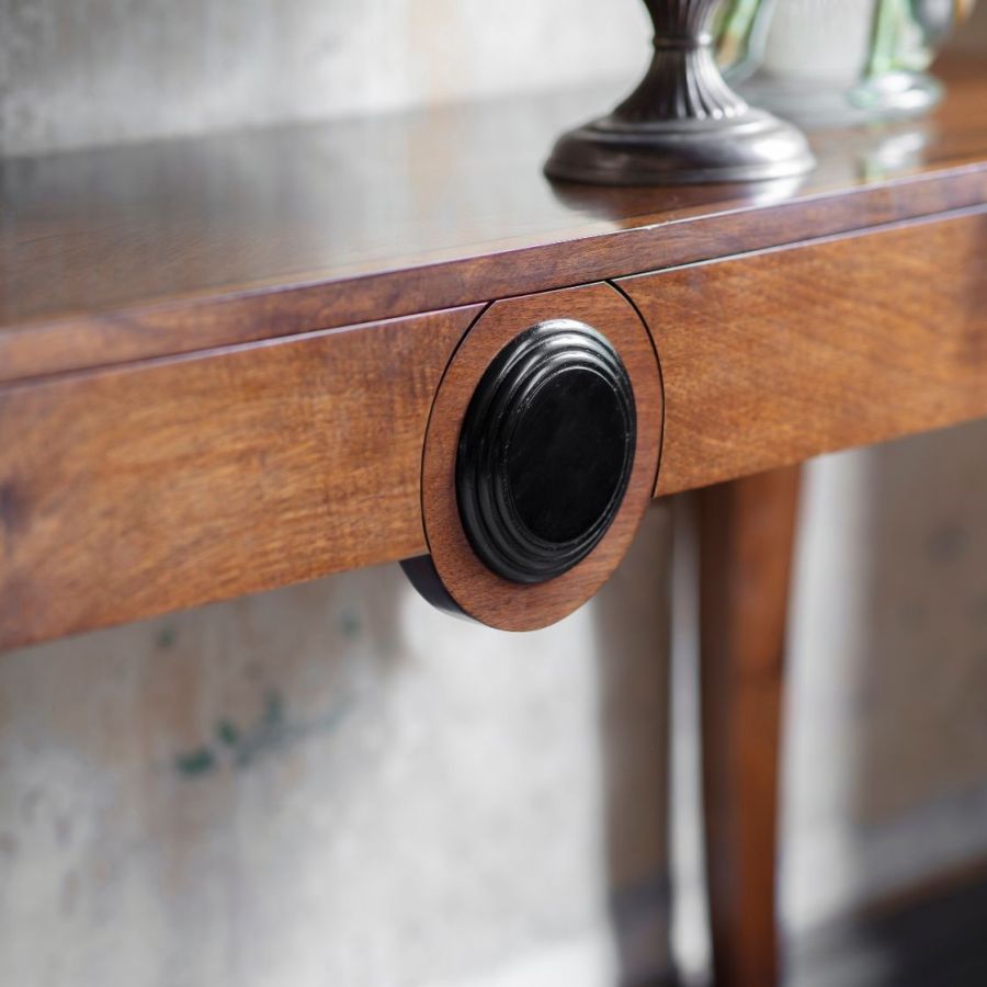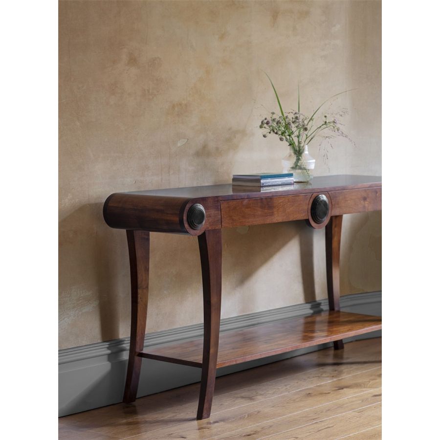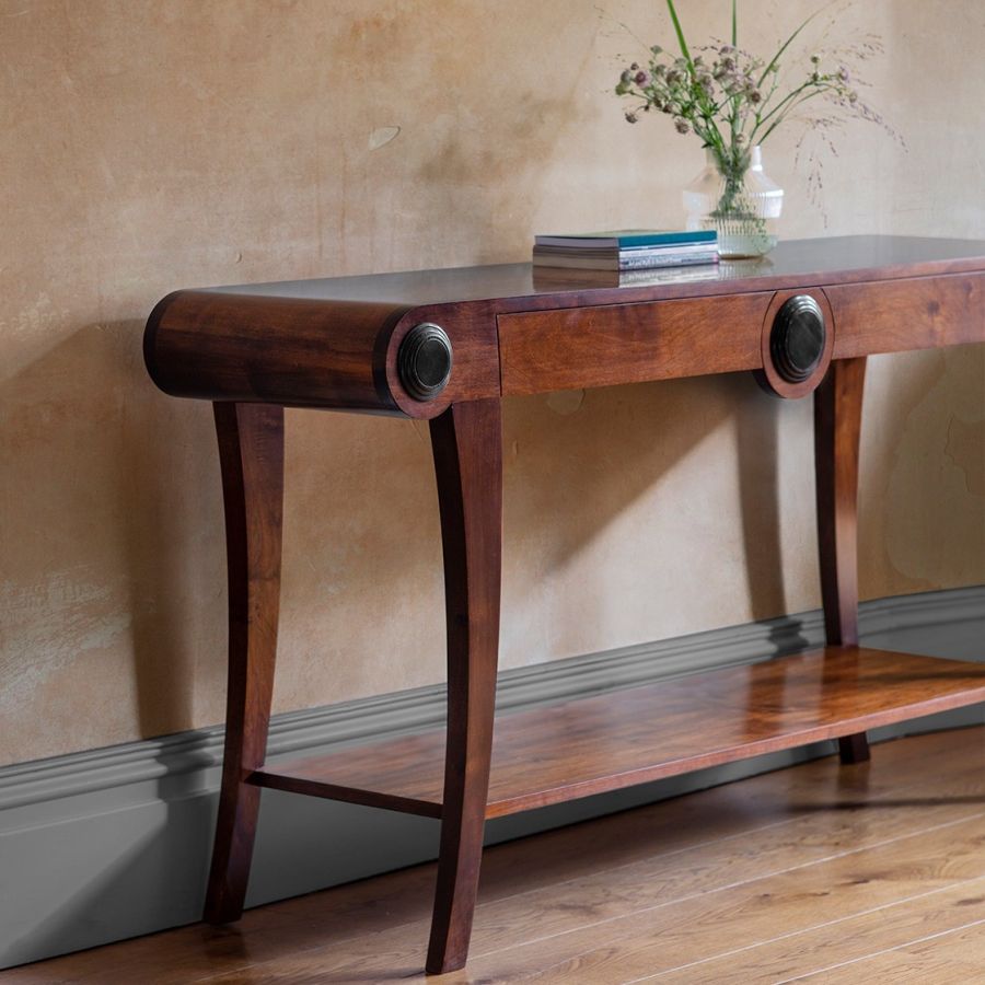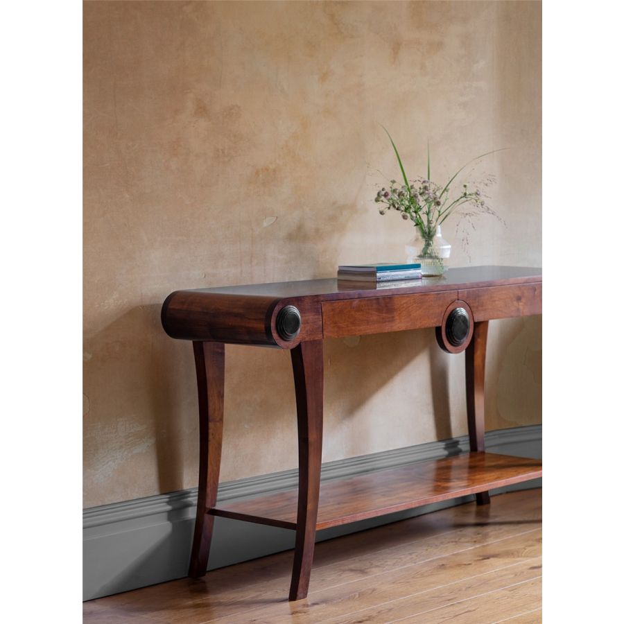 Crafted from solid walnut, the Art Deco inspired Duke console table is an example of fine English furniture at its very best. The graceful legs and exceptional finish deliver a statement piece for any setting.