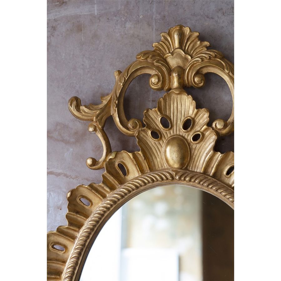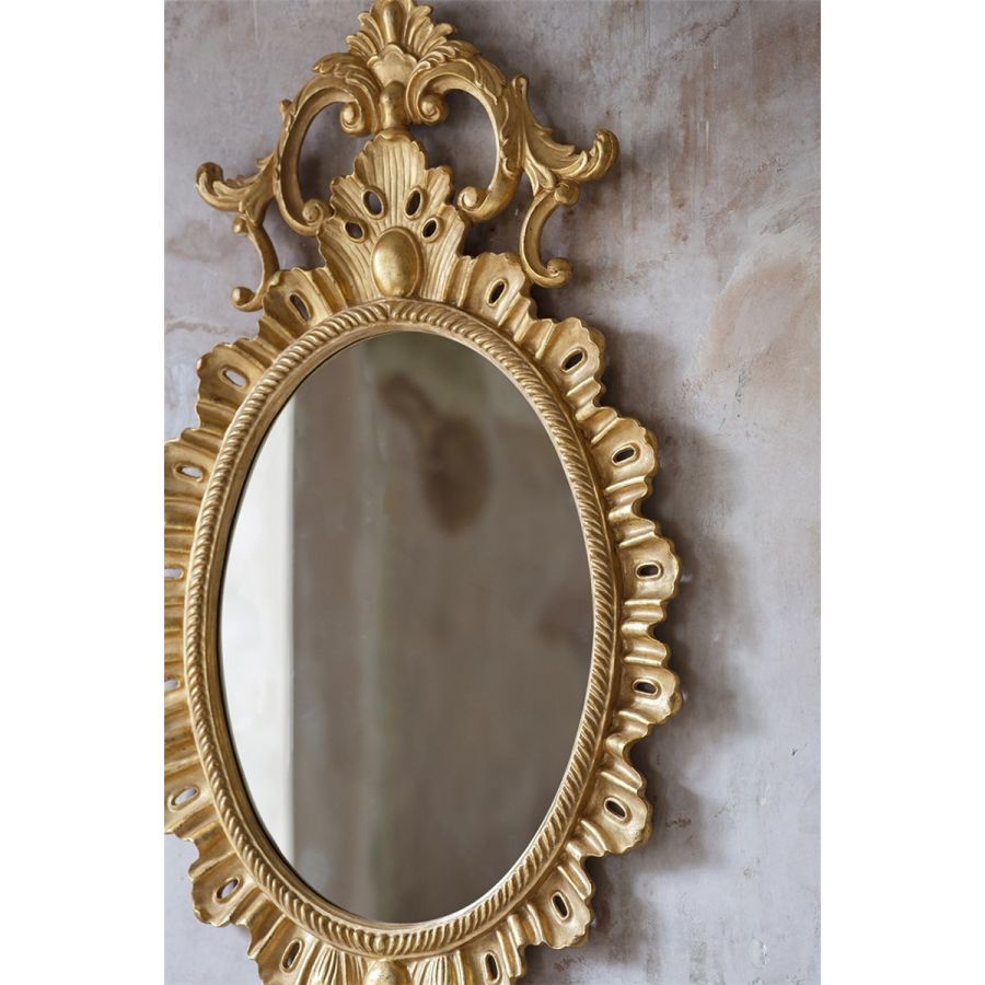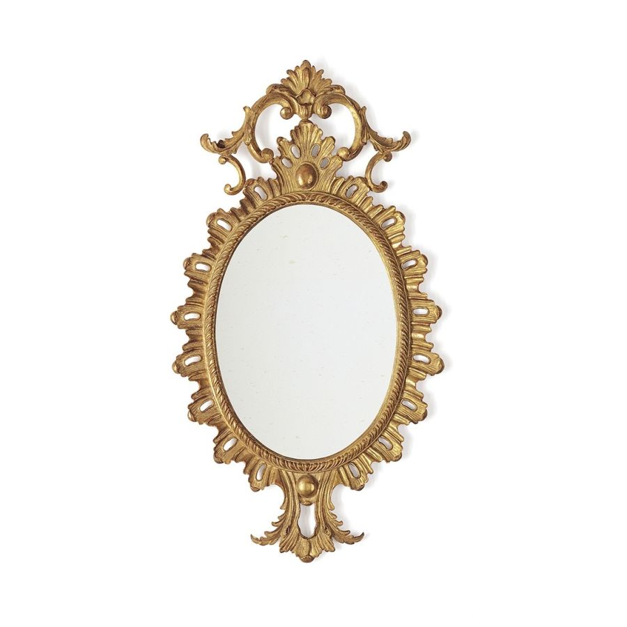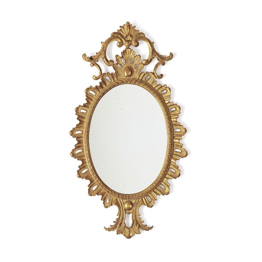 A formal oval mirror in an early Georgian style, the Belgrave has a rich but restrained decorative design, surmounted by an arch of giltwood scrolls and foliage.