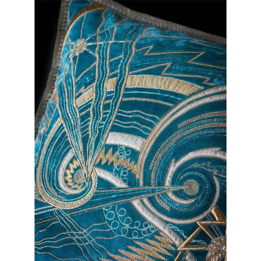 Our Couture cushions are bespoke and hand embroidered to order. They can be created in fine gold or silver silk thread and embellished with freshwater pearls and semi-precious stones. Each pattern can be coloured and designed to fit your needs. We can embroider onto almost any background fabric, including silk, velvet, organza and even leather