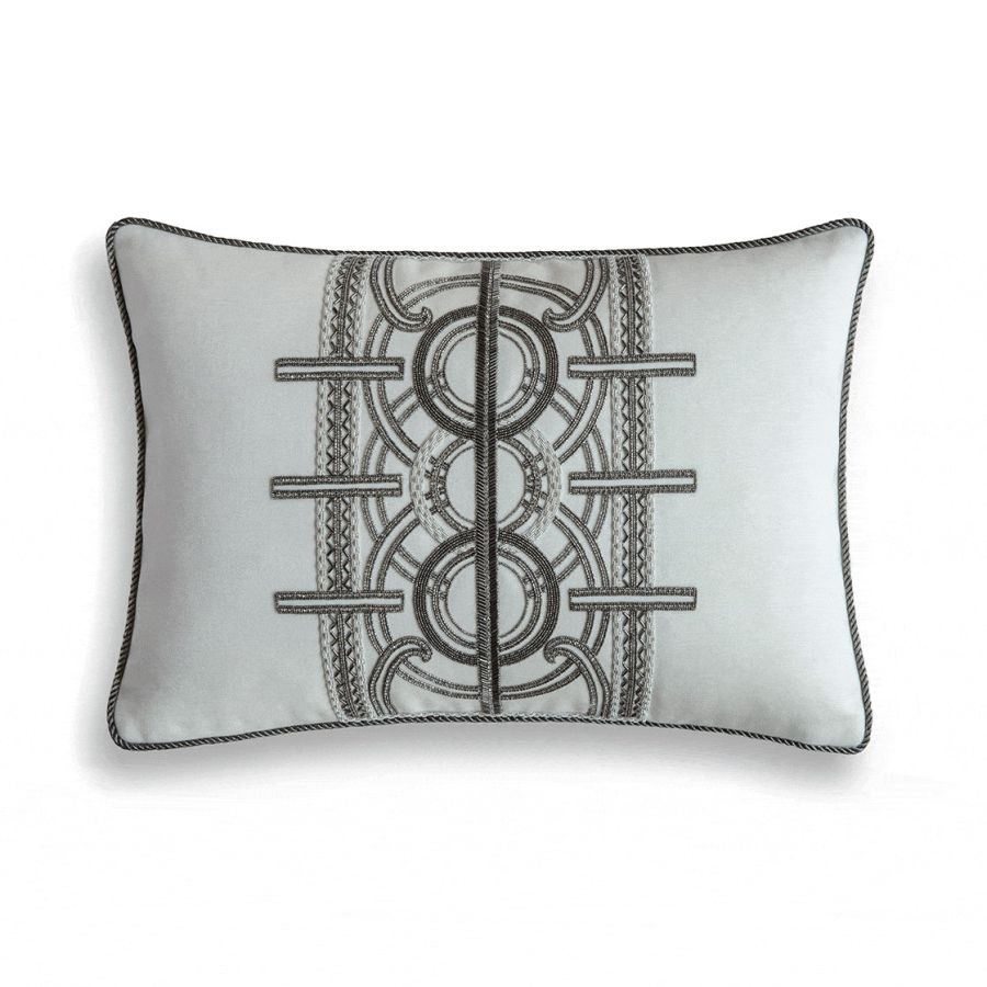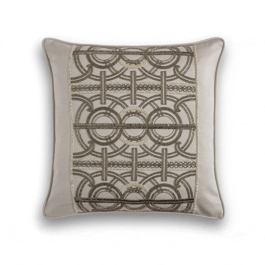 The striking design of the Art Deco inspired Circe cushion comprises hand embroidered circles, strong regimented lines and exquisite beadwork.