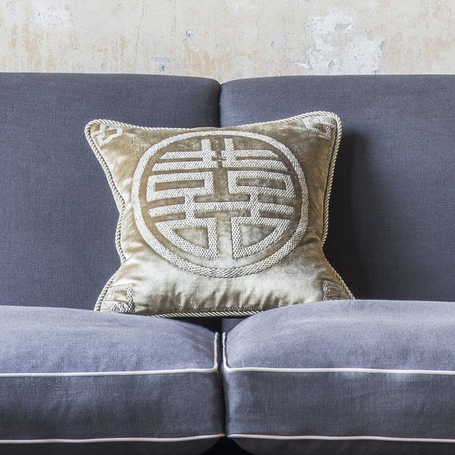 Skilfully embroidered in a richly worked metal thread to create depth, this couture cushion evokes good fortune in your home.