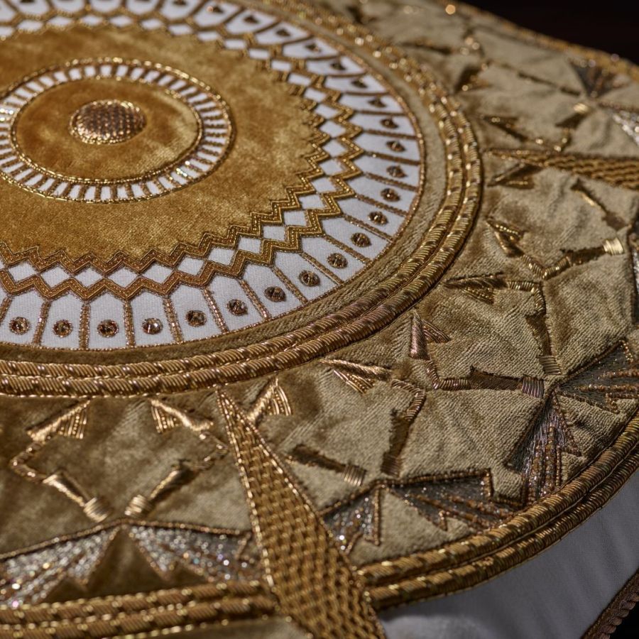 An opulent design, Ettore is beautifully hand embroidered with metallic threads, semi-precious stones and applique.