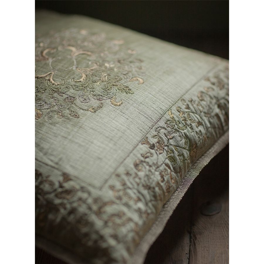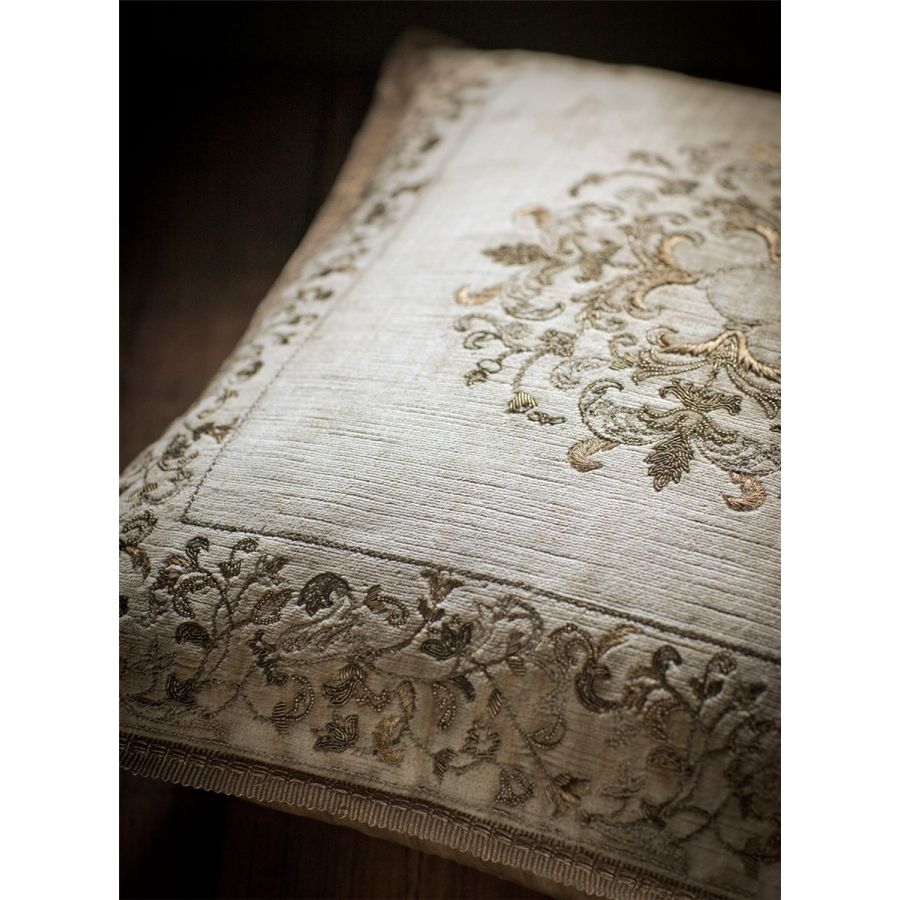 Our Couture cushions are bespoke and hand embroidered to order. They can be created in fine gold or silver silk thread and embellished with freshwater pearls and semi-precious stones.