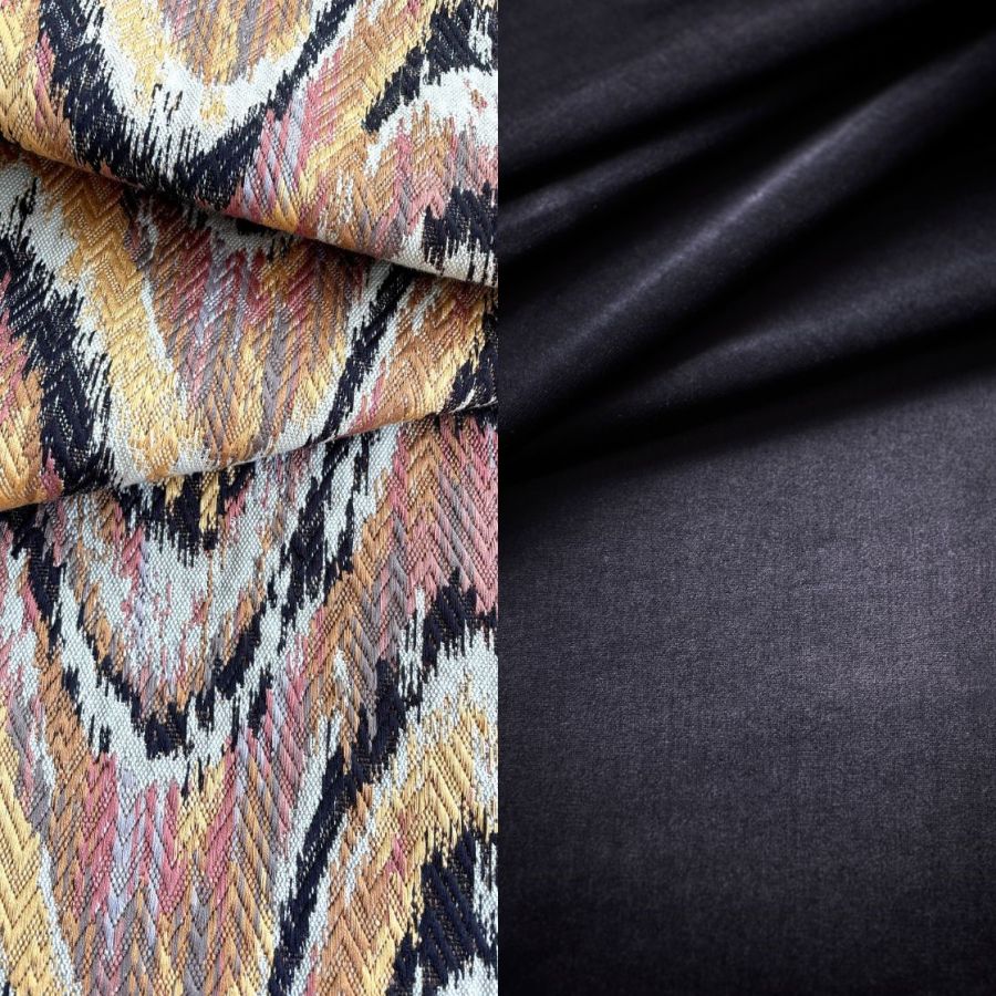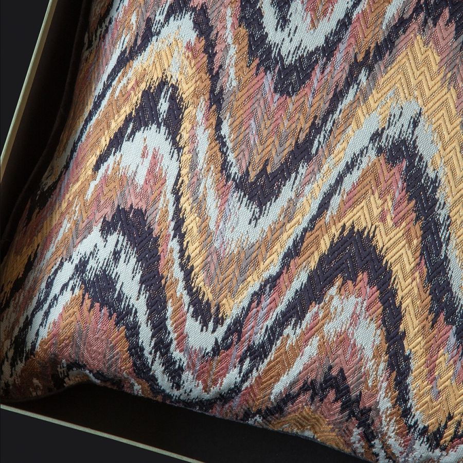 This striking flame stitch cushion is piped and backed in our Capri silk velvet in Midnight and combines rich golden hues with pretty shades of pink and purple. Available for immediate delivery.