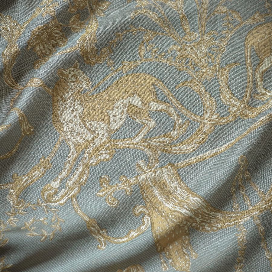 Inspired by Georgian designs, our Lawrence cushion depicts cheetahs prowling through twirling lanterns, scrolls and tassels. It is backed and piped in Como silk velvet – Biscuit and available for immediate delivery.