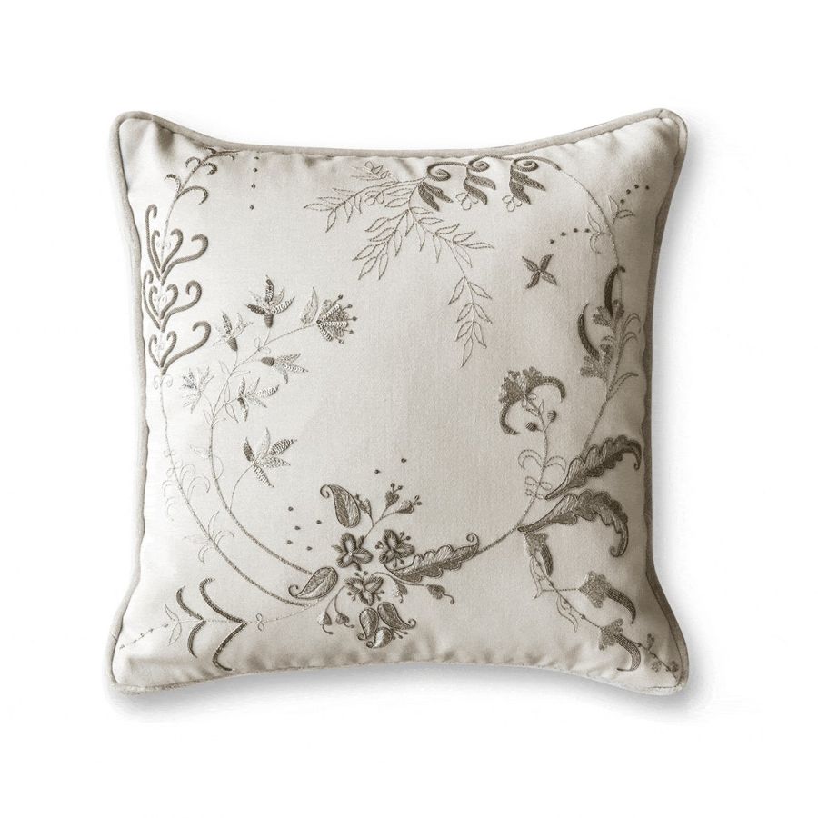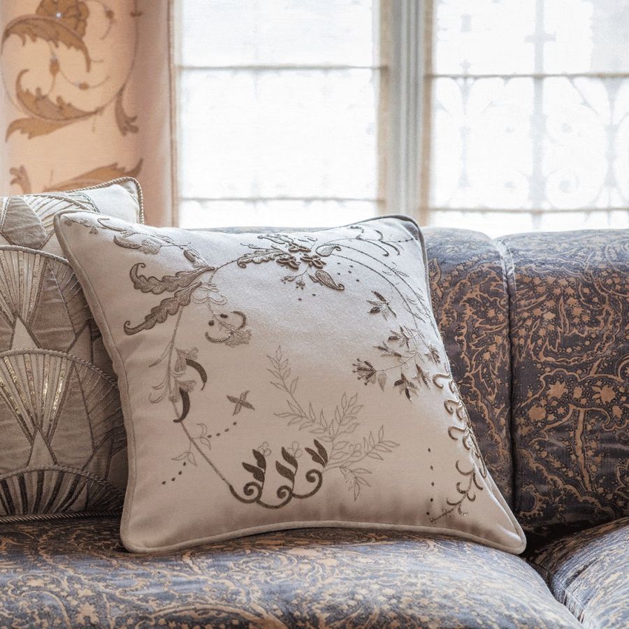 Our Couture cushions are bespoke and hand embroidered to order. They can be created in fine gold or silver silk thread and embellished with freshwater pearls and semi-precious stones.