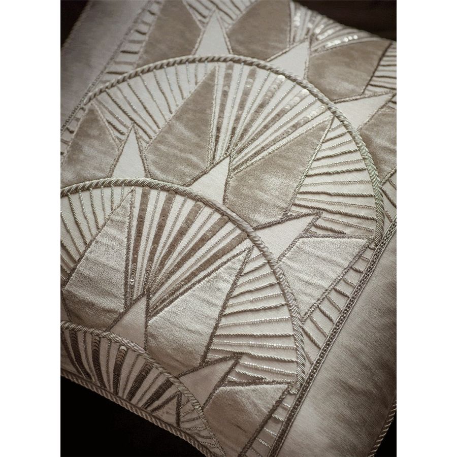 Rockefeller is a striking border design inspired by the Art Deco era and New York skyline. Embroidered in metallic threads, with contrasting applique fabric in silk or velvet.