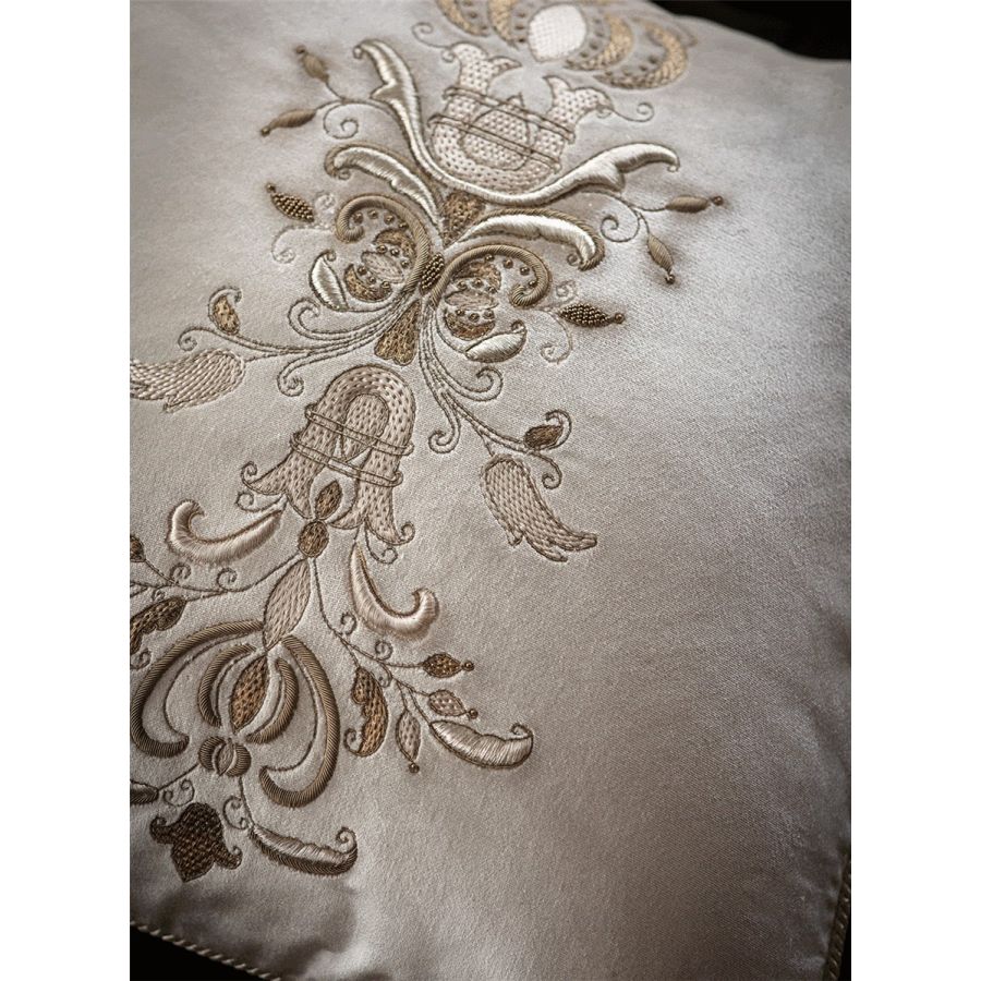 Our Couture cushions are bespoke and hand embroidered to order. They can be created in fine gold or silver silk thread and embellished with freshwater pearls and semi-precious stones.