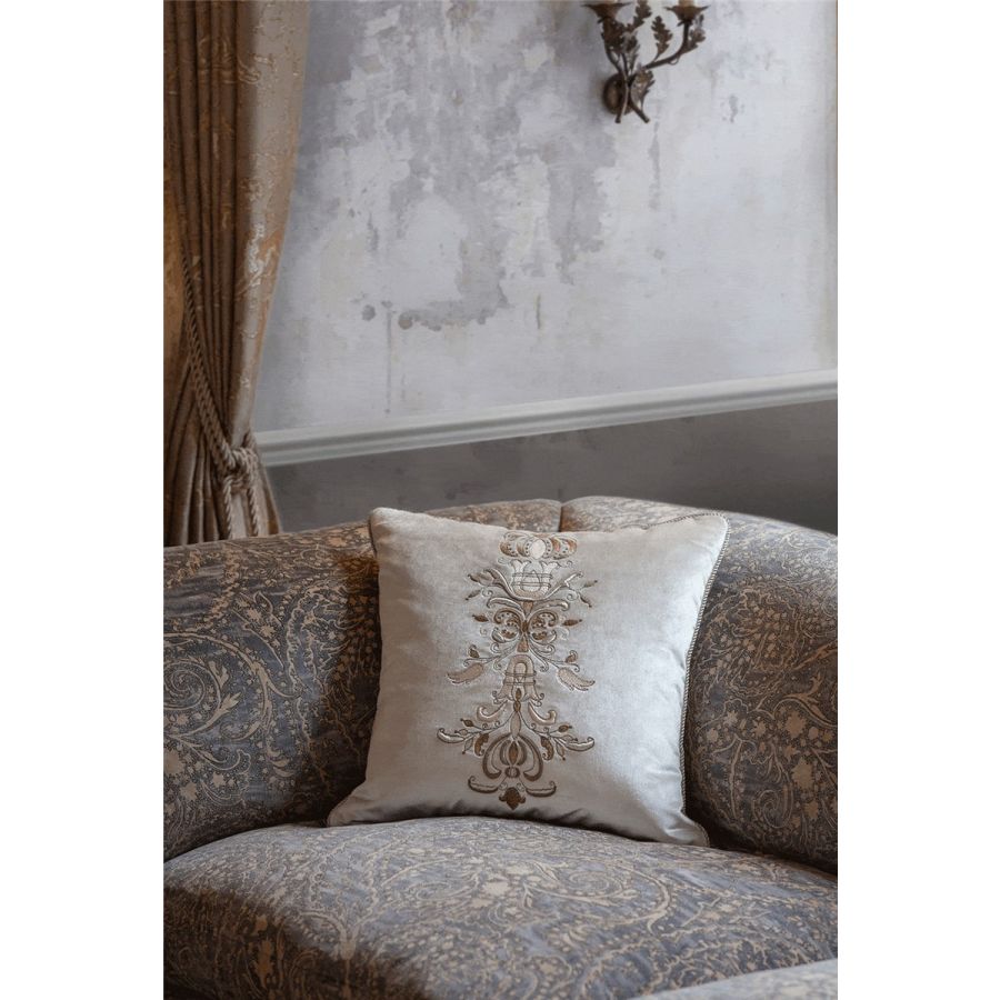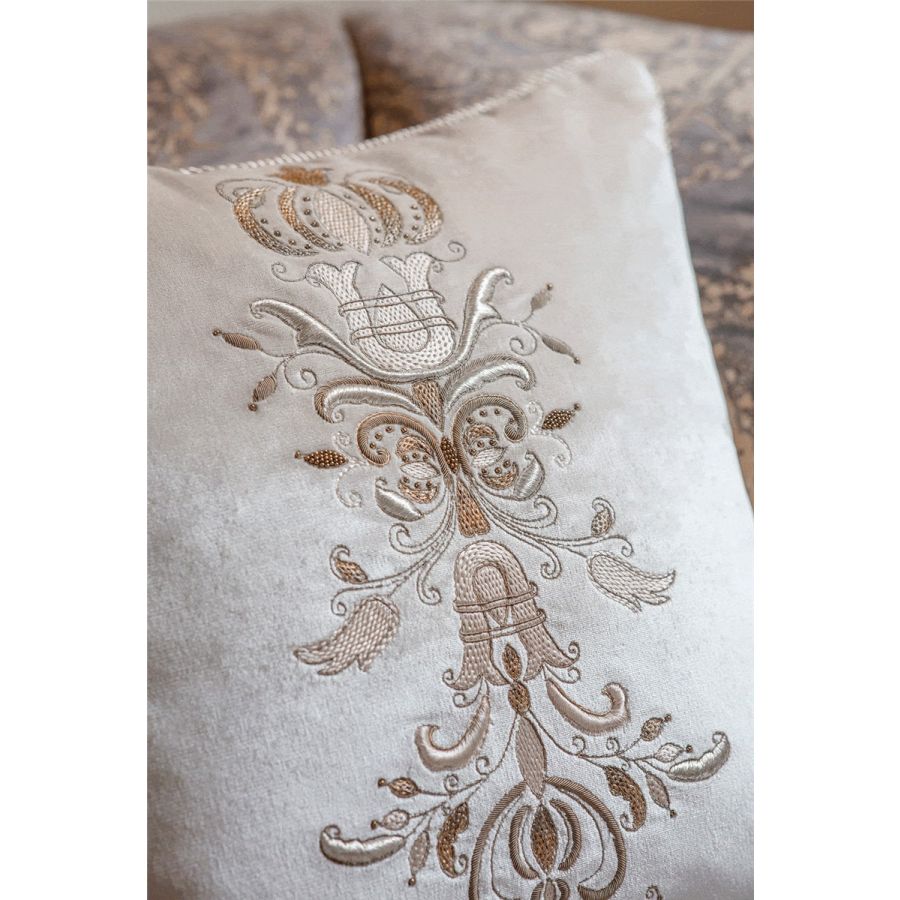 The inspiration for Zola was taken from the Baroque period. With itscolumn ofembroidery in fine needlework, thiscushiondesign pays homage to the skilful artistry of our workshop.